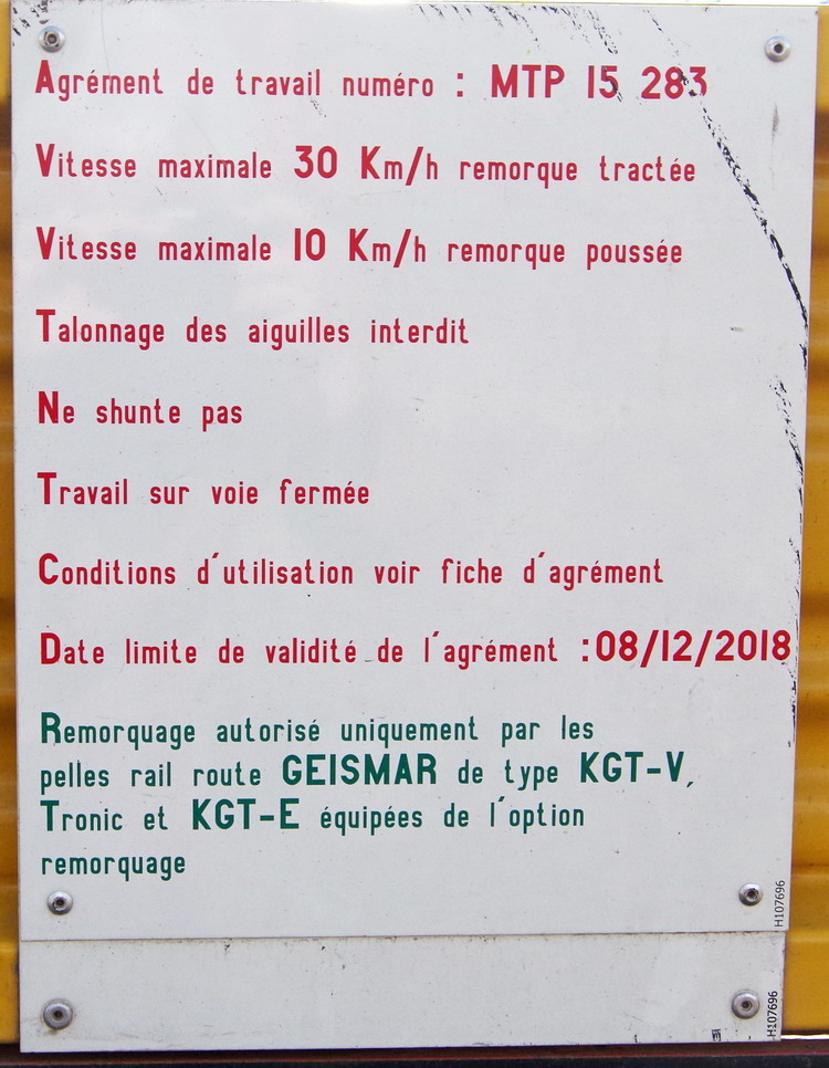 remorquage autorisé uniquement par les Pelles Rail route Geismar de type KGT-V Tronic et KGT-E équipées de l'option remorquage