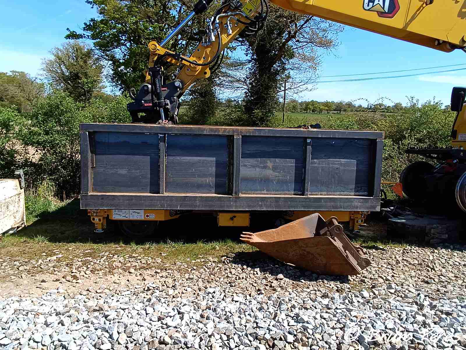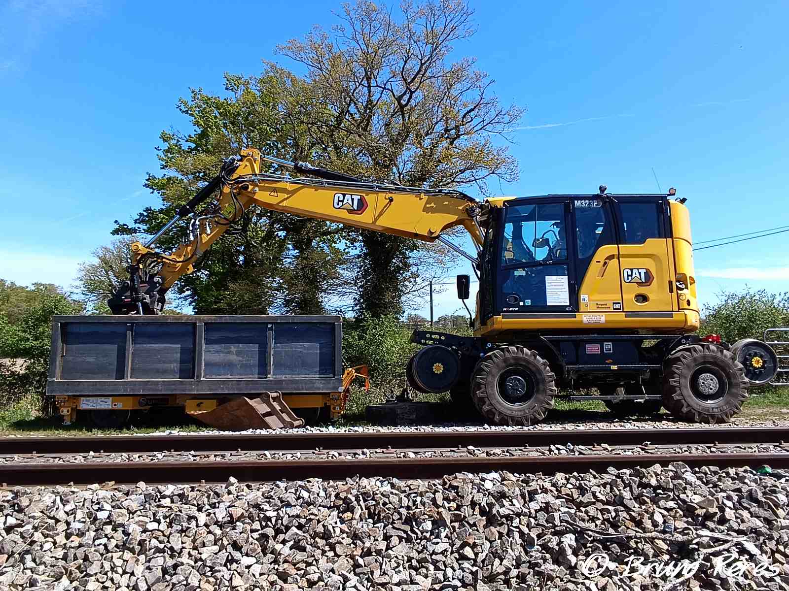 Voici une remorque UNAC bien modifiée. Malheureusement, la plaque constructeur était totalement inaccessible, et je n'ai pas su voir d'information me permettant d'identifier le propriétaire. Celui de la pelle étant a priori Unifer, j'en déduis que la remorque appartient également à Unifer, mais sans certitude. Je les ai croisées sur le RVB Limoges Poitiers le 11/04/2025.
