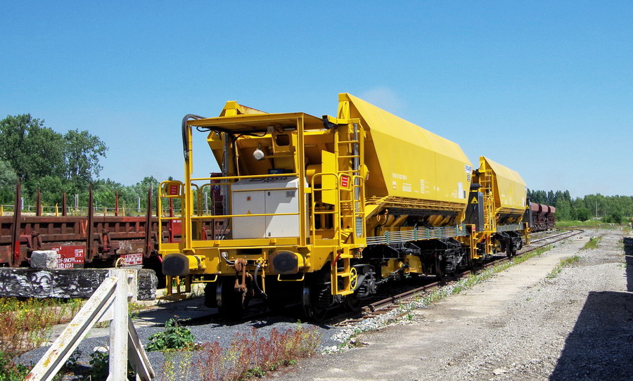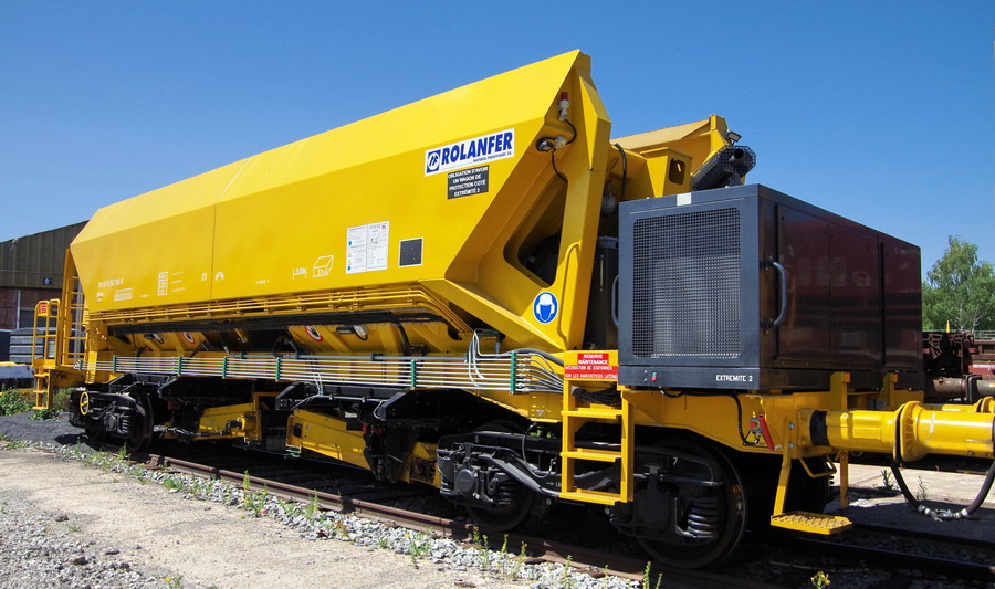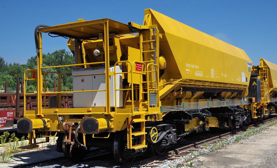 avec deux trémies et possibilité de ballastage, et aussi pour récupérer l'ancien ballast et qui le vide avec les bandes transporteuses