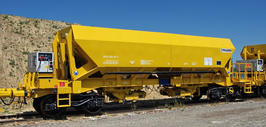 avec deux trémies et possibilité de ballastage, et aussi pour récupérer l'ancien ballast et qui le vide avec les bandes transporteuses