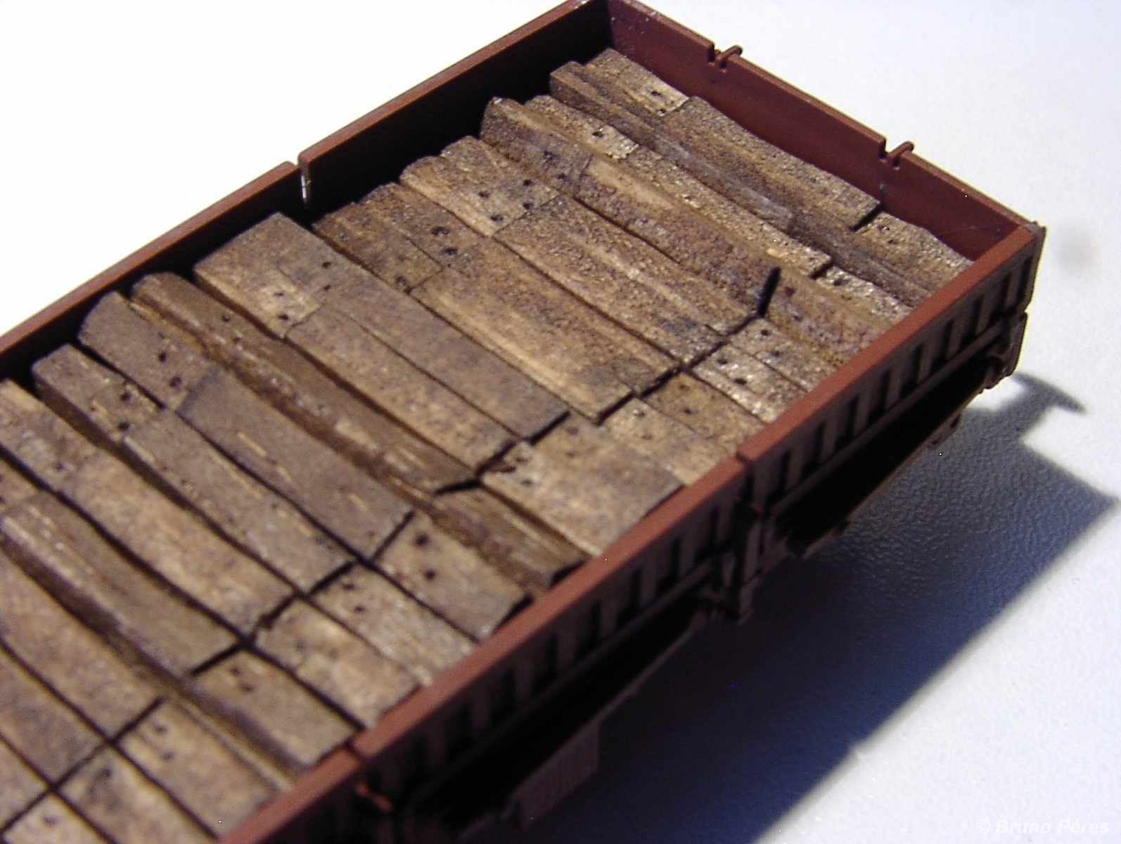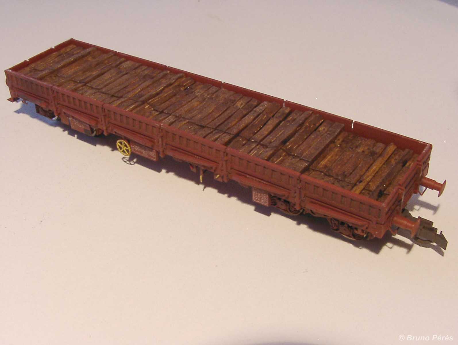 Le wagon est superdétaillé en suivant les recommandations de Bernard Ciry dans le RMF n° 492 de juillet 2006. Ne pas hésiter à amincir les plaques à coller sous châssis car elles empêchent les boggies de tourner sur les petits rayons. Je viens de l'apprendre à mes dépends :evil: :evil: :evil: