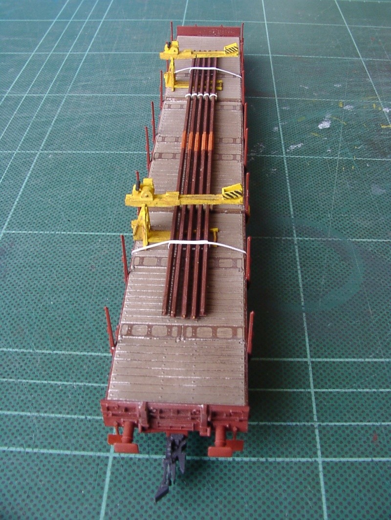 Le maintien des rails sur le wagon (sangles) est simulé de la même manière que pour les cales, bien entendu après avoir collé ces rails sur deux longues cales en bois (profilé Evergreen en fait) collées elles-mêmes sur le wagon.