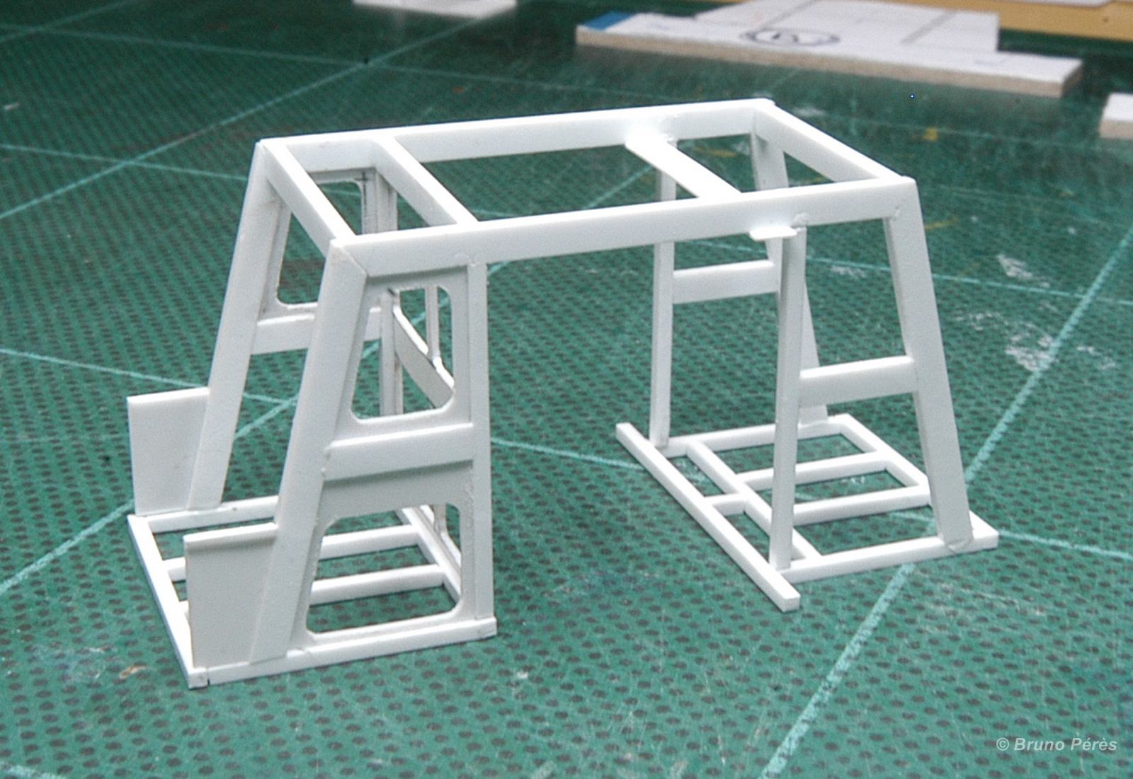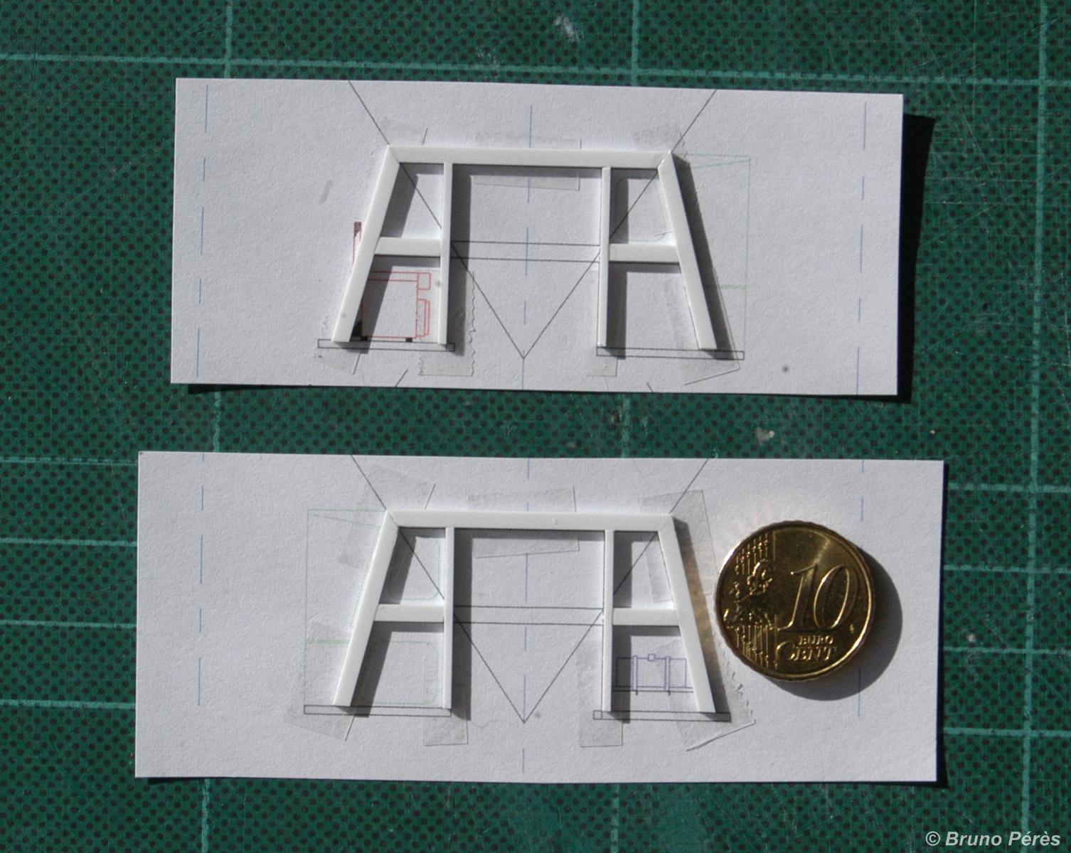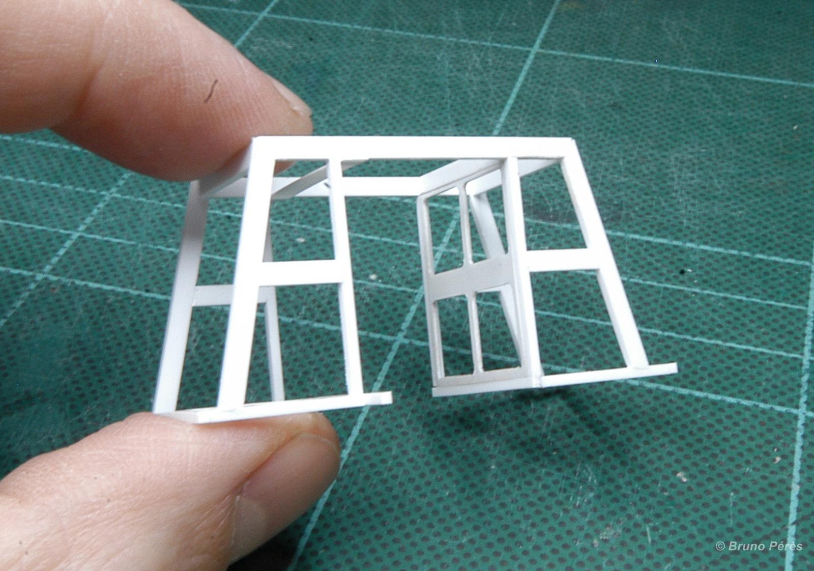 Voici une toute petite avancée, mais une jolie pièce un peu délicate à réaliser et à ajuster en raison de l'épaisseur de la carte plastique utilisée d'une part (0,5mm), et de l'épaisseur des montants d'autre part (moins de 1mm pour les plus fins) sans tout abimer ! Il me restera à découper les vitrages et à les ajuster au mieux :reflexion: