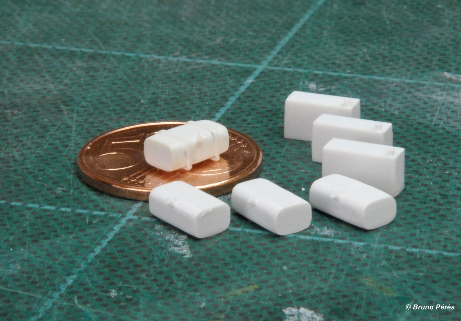 J'ai aussi attaqué 6 réservoirs de 2 types différents, dont 3 identiques à celui déjà montré plus haut. Je n'ai pas encore réalisé les sangles de maintien car leur positionnement dépendra du modèle reproduit. Ils prendront place sur caleuses et MRT.