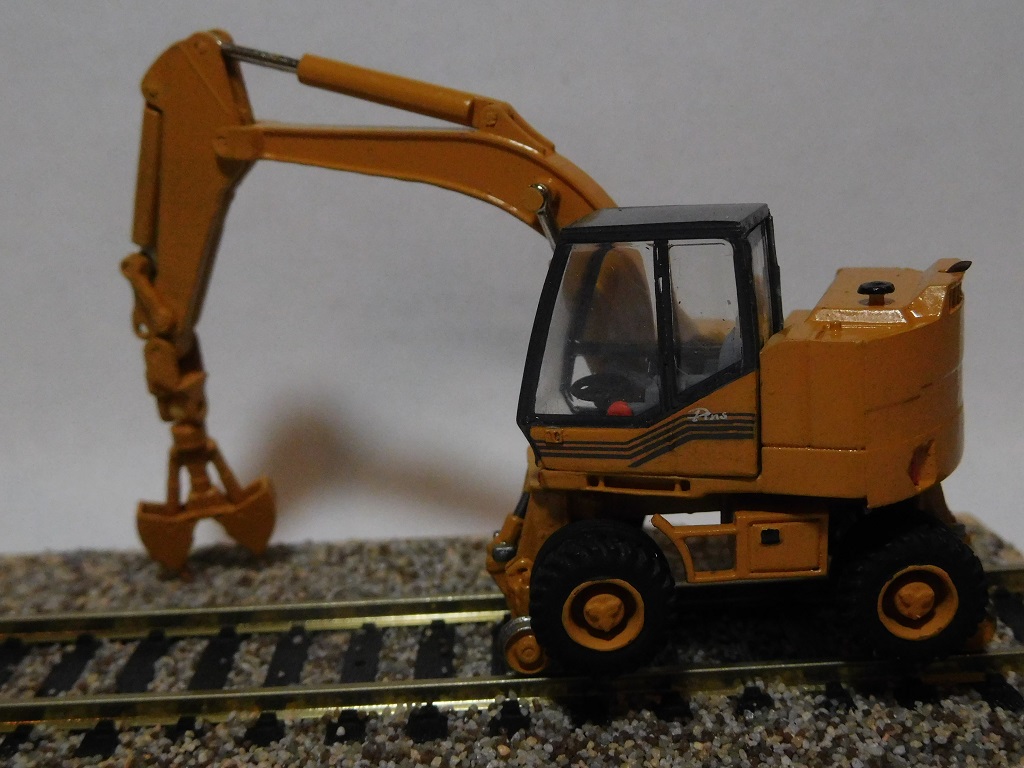 Il s'agit d'une pelle rail-route de la marque CASE-POCLAIN modèle 588 PRR avec sa benne preneuse ARDEN EQUIPEMENT BA 402, le tout à l'échelle HO :