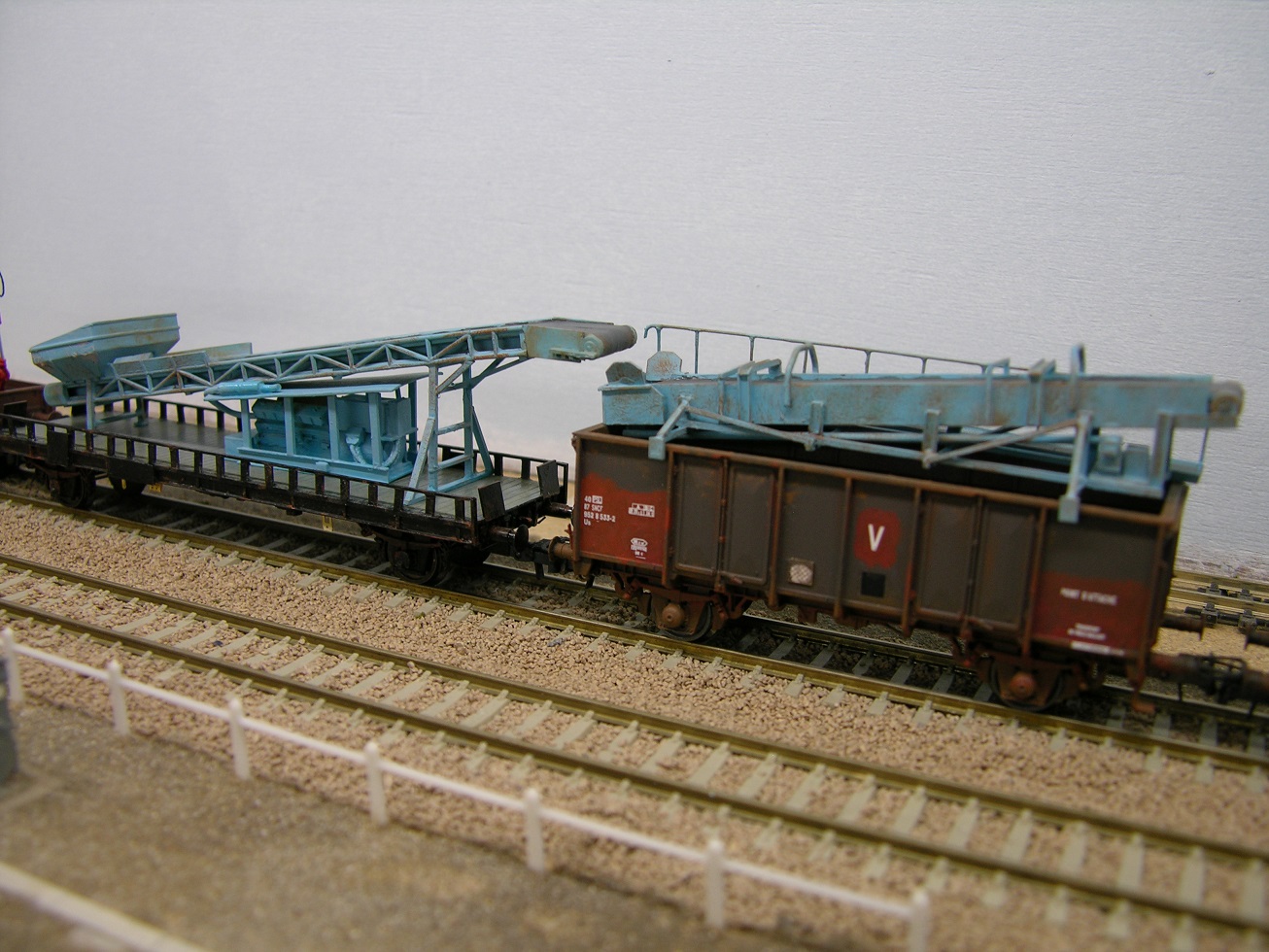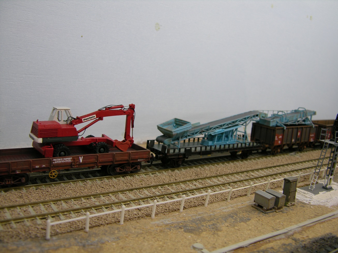 Le plat est censé représenter un wagon UFR bi porteur (réalisation approximative) et le wagon tombereaux (il y en a cinq) est un ROCO repeint et ré-immatriculé