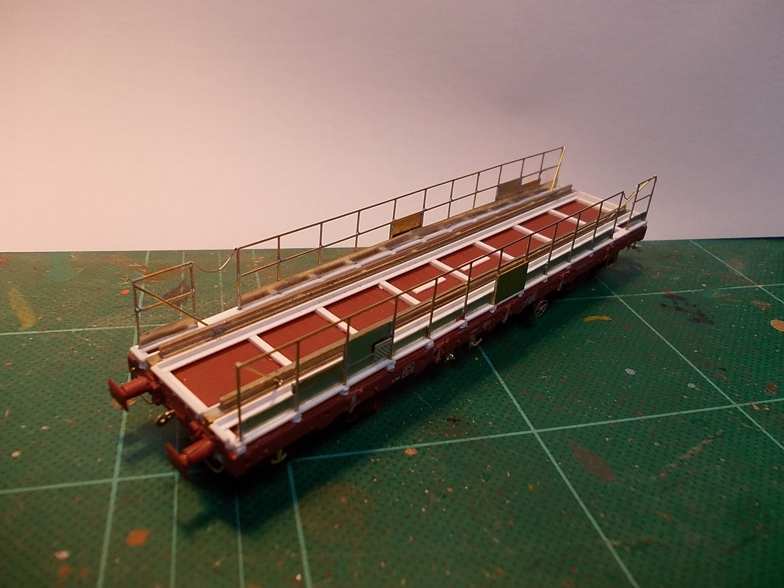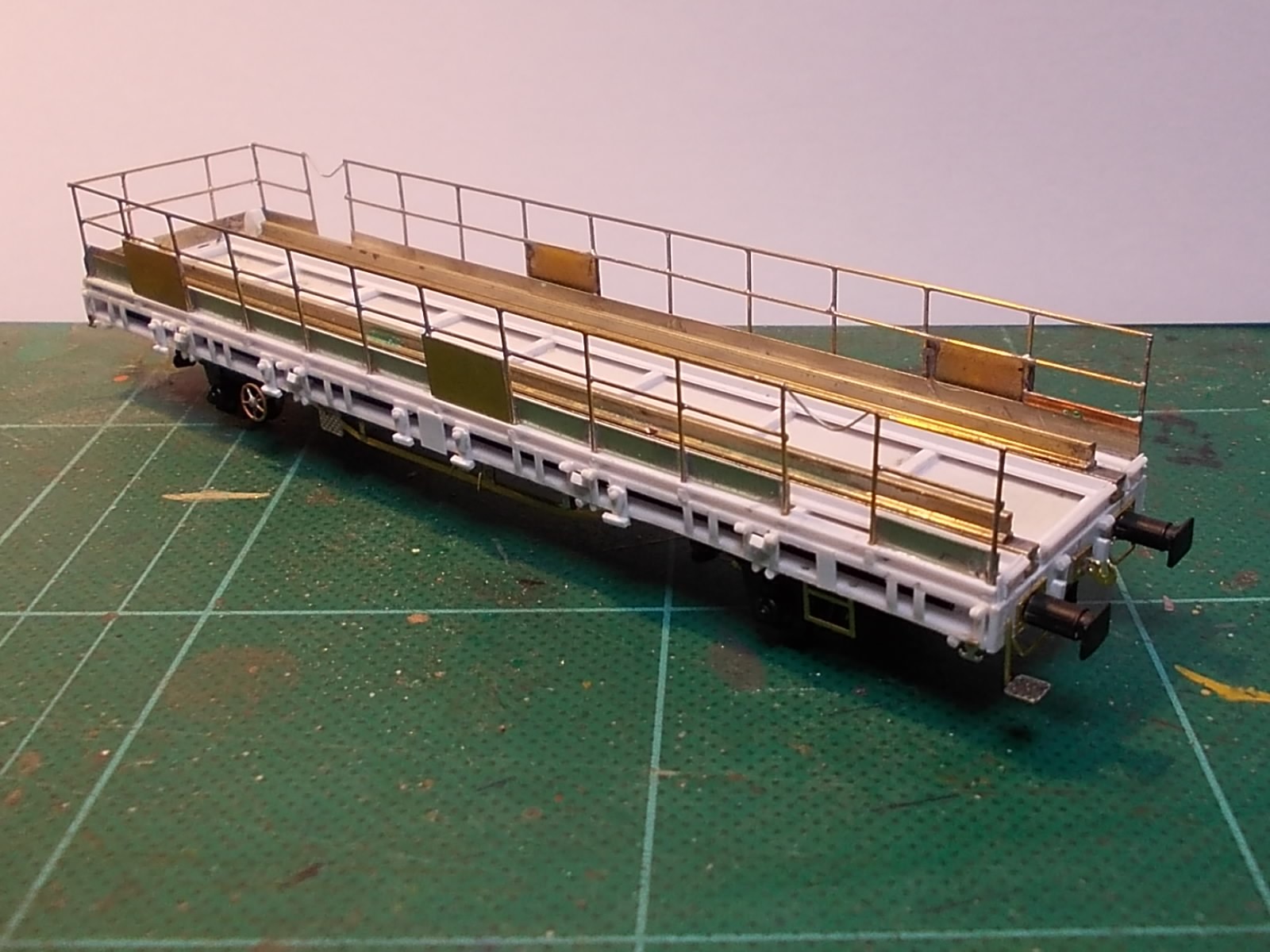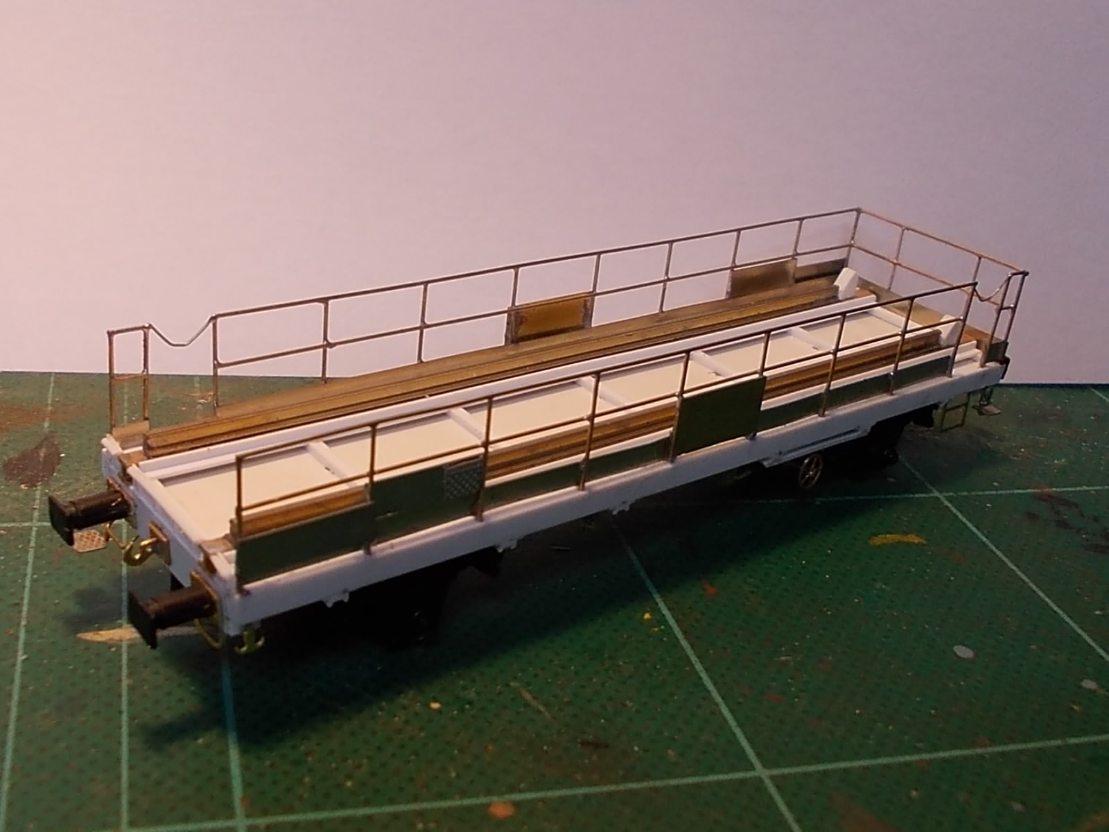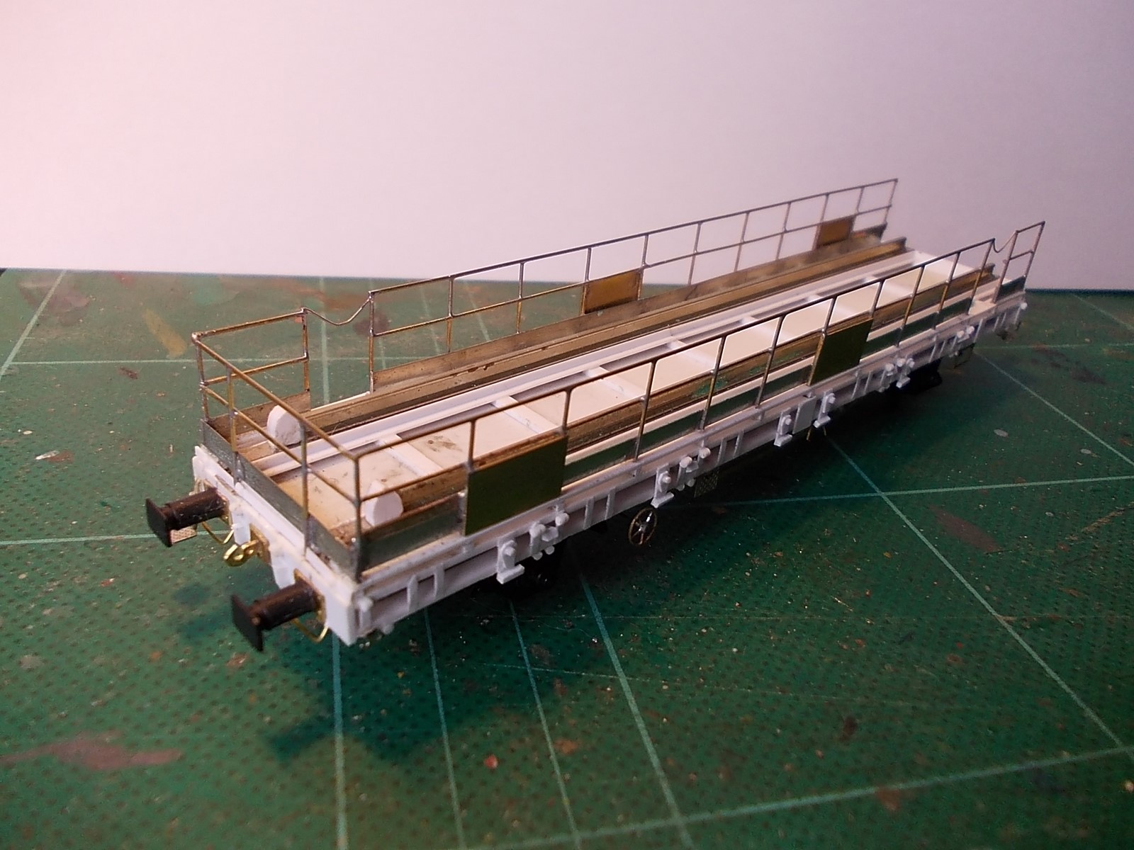 Voici une rame de wagons indissociables à tarer les bascules en cours de construction ,il en existe plusieurs,celle reproduite sera celle du dépôt de Longueau.La construction est intégrale sauf le Remms Oskar.Reste la mise en peinture et la pose de caillebotis Décapod ainsi que les fûts de charge.