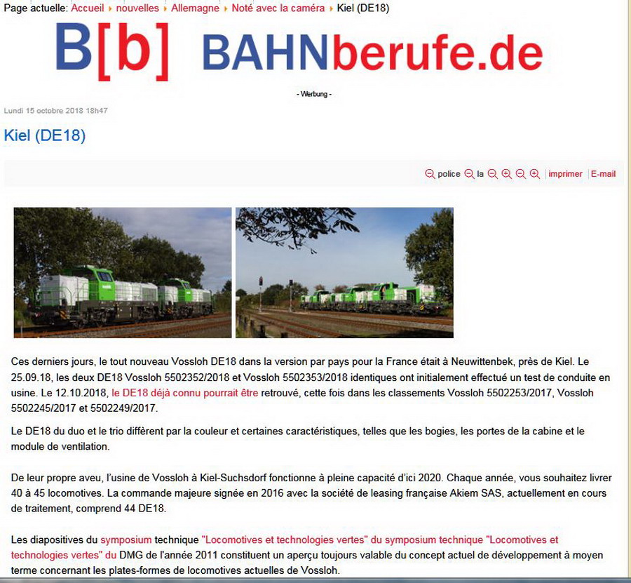 et un article du 23 octobre 2018 avec une photo des DE 18 5502245 et 5502249 pour AKIEM