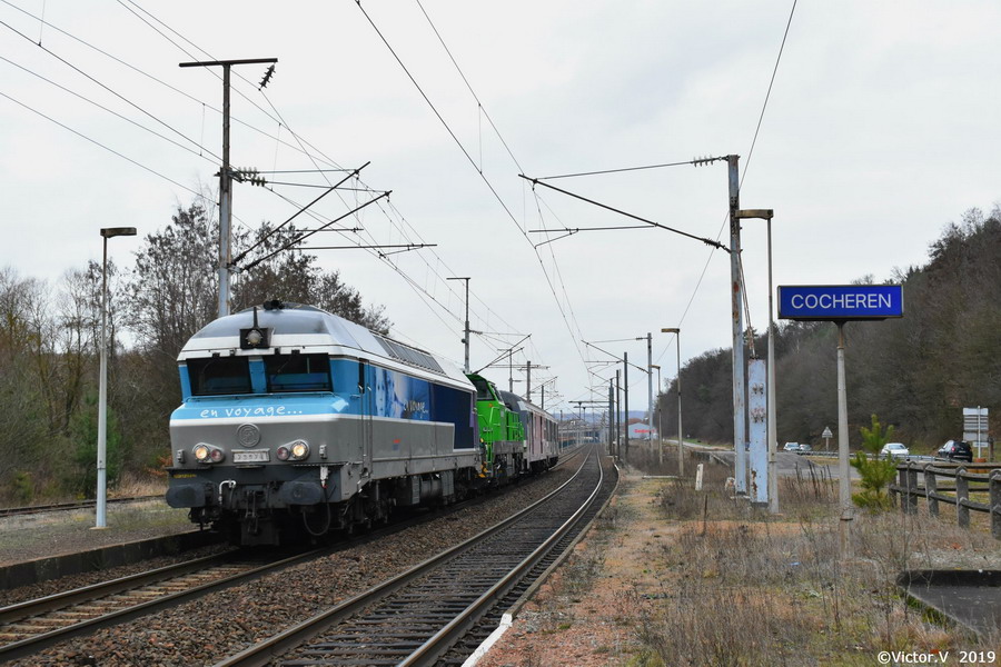 et passage en gare de Cocheren (57) entre Forbach et Béning vers 16h25 entre la CC 72074 et deux fourgons charge de type ex MC76 Dd2
