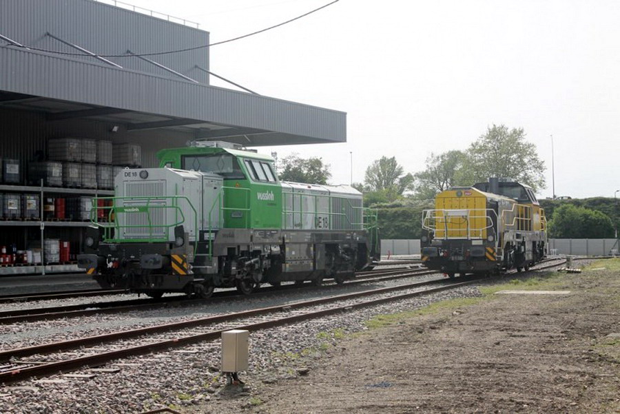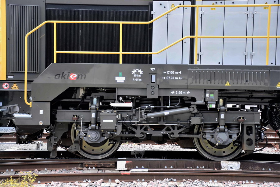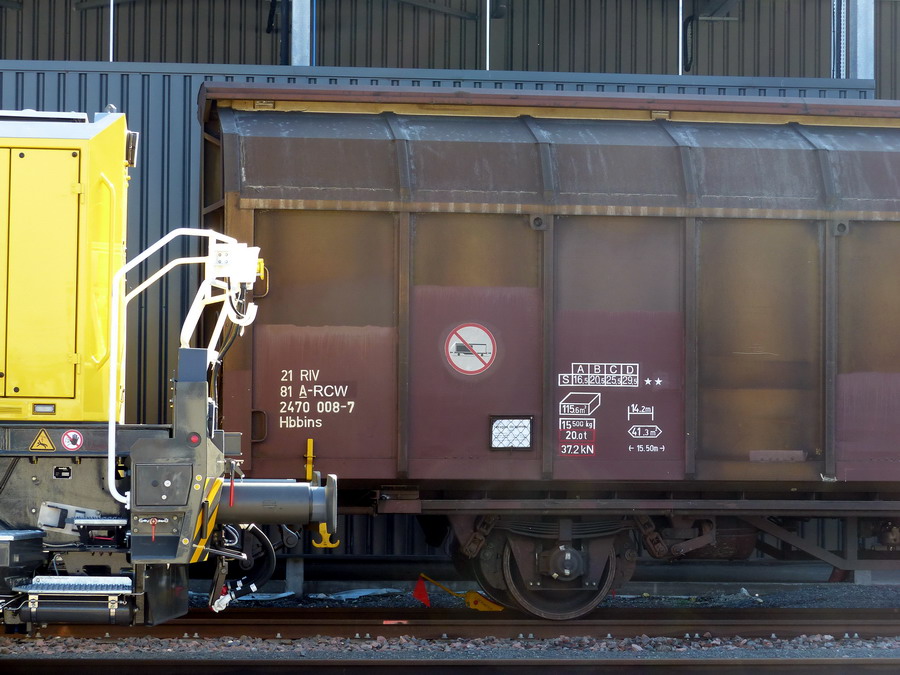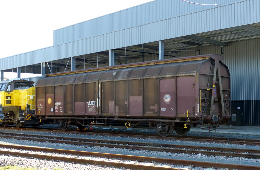 et le wagon d'accompagnement à essieux et parois coulissantes depuis la sortie de l'usine Vossloh à Kiel 21 81 2470 008-7 Hbbins RIV A-RCW