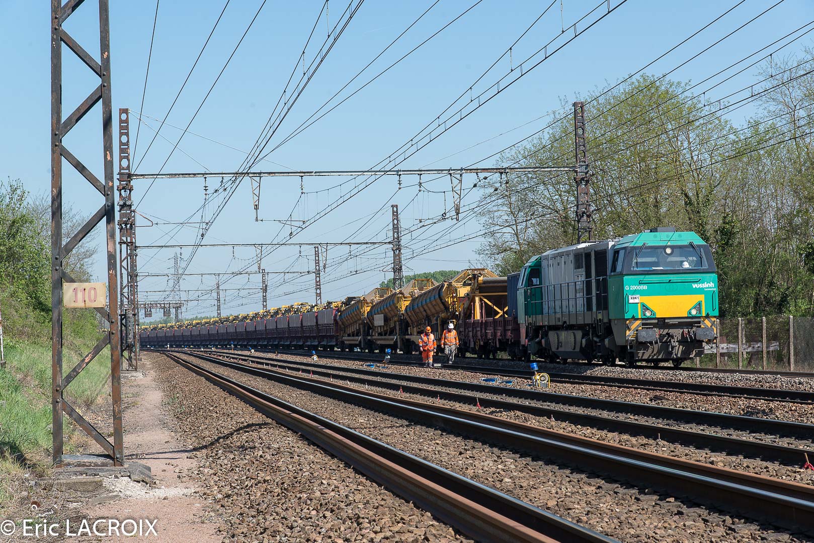 G 2000 BB 5001603 - 92 87 0 002 011-0 F - ETMF en tête du train de dégarnissage Matisa C-75 - 99 87 9 314 507-4 GCF Roma passe à Villeperrot (89) pour rejoindre la base de travaux de St Florentin. Avril 2017.
