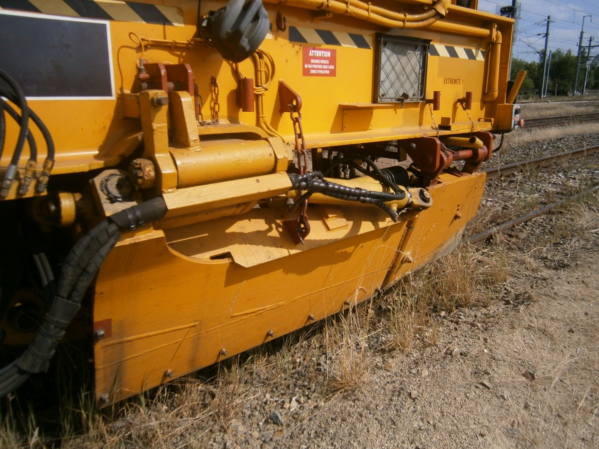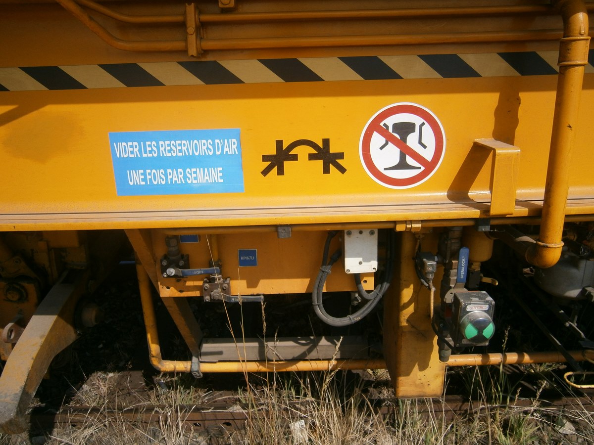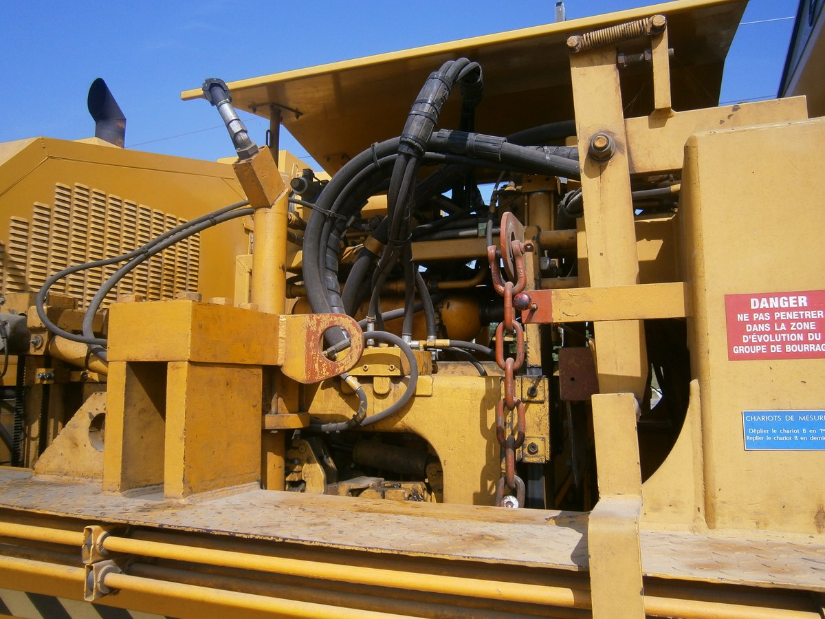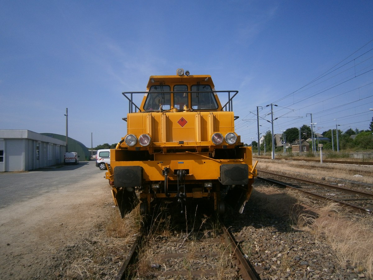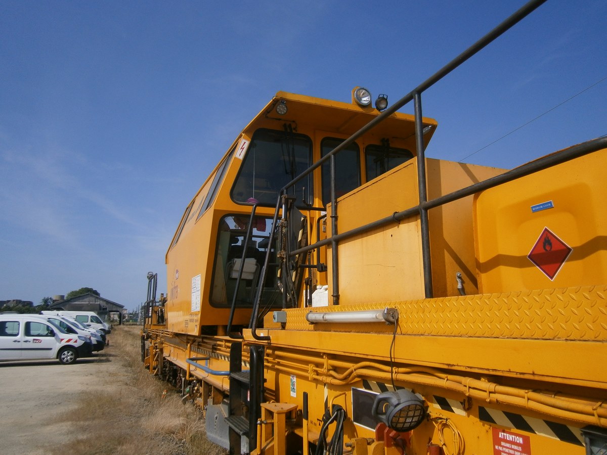Voici une Bourreuse Combi 20 non identifiée - Point d'attache Elog Bretagne avec la voiture 80 87 979 3 305-9 Uas H55 0 SNCF-RN