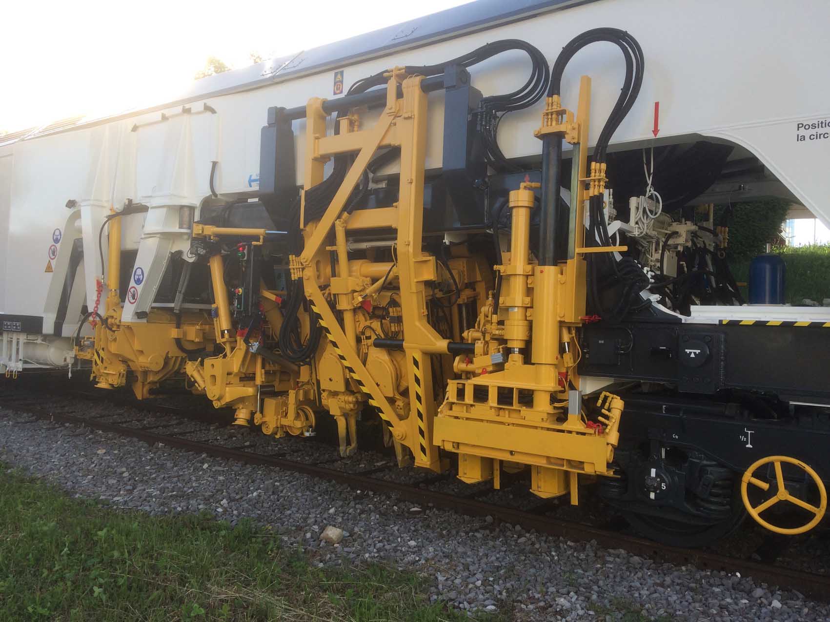 Cette bourreuse est équipée d'une stabilisation partielle dynamique de la voie, dans le cadre des restitutions de voies aux circulations commerciales à 80 km/h.