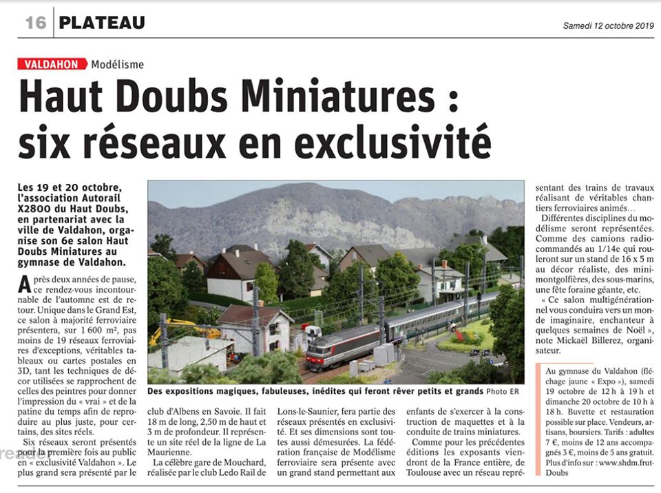 L'association "L'Autorail X2800 du Haut-Doubs" organise le 6ème Salon Haut-Doubs Miniatures qui se tiendra les 19 et 20 Octobre 2019 durant les vacances de Toussaint au gymnase du Valdahon (25)