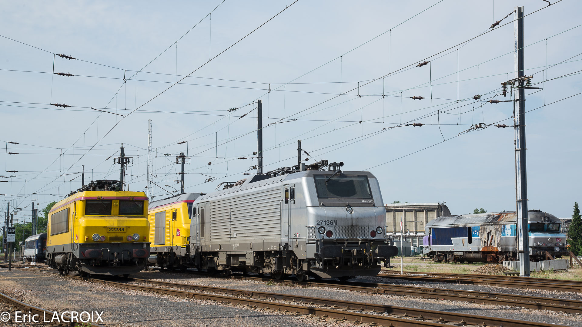 BB 27136 akiem louée à l'INFRA et BB 22288 en relais à Chalindrey en juin 2015.