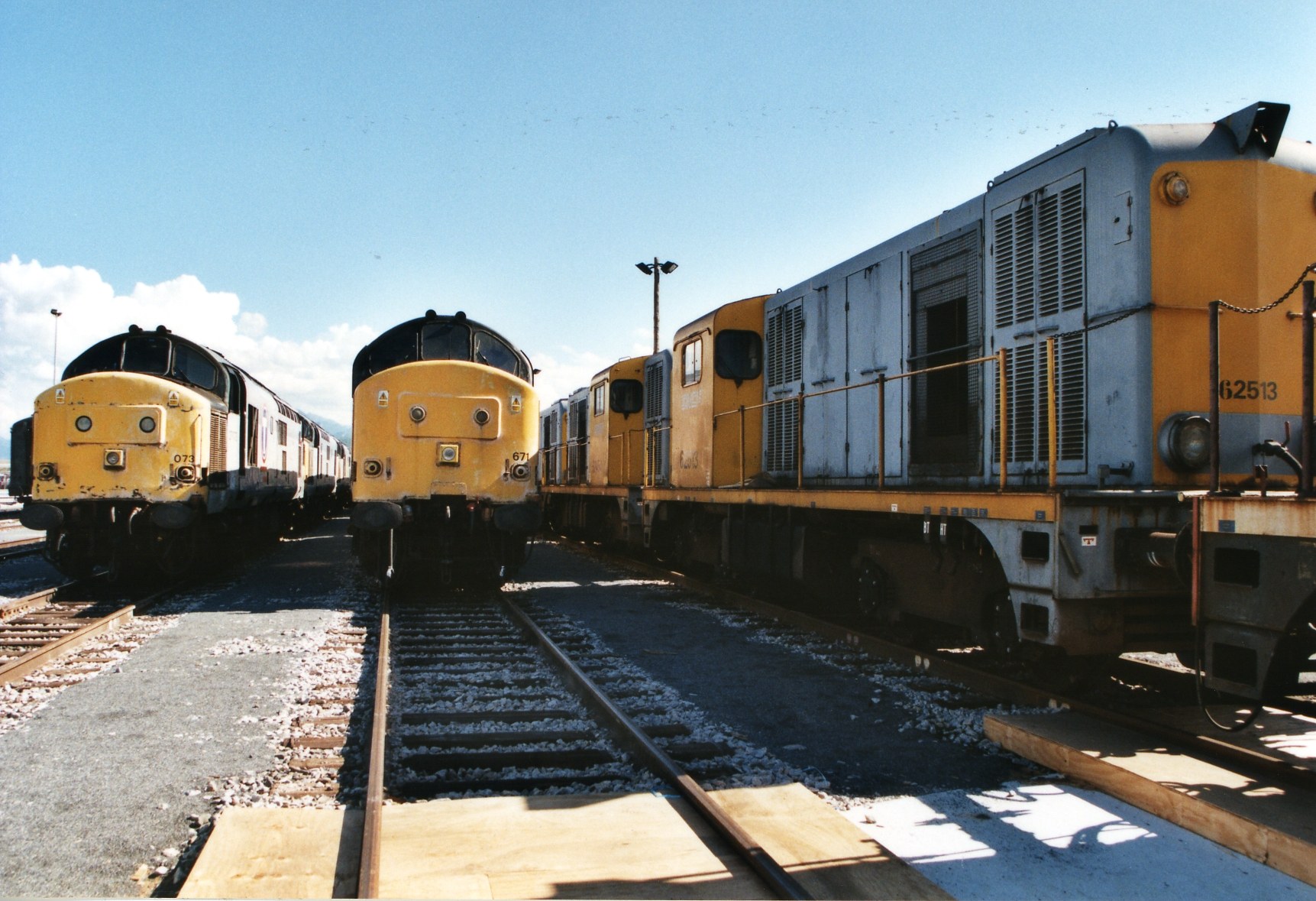 Voici l'autre locomotive en livrée rouge grenat, la 62501 saisi en base travaux d'Eurre, entourée par les grosse diesels britanniques. Interessant, l'ancien sigle SNCF 'encadré'.
