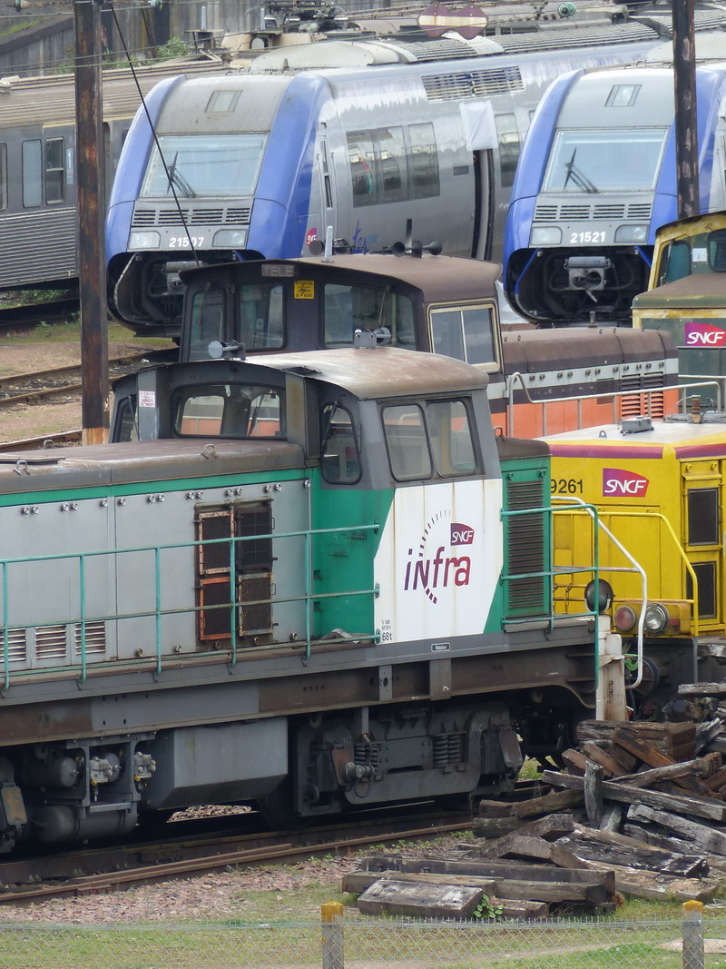 Voici la 664633 en livrée Fret avec le logo Infra entre le Y 8265 Infra et les 669261, 69237... à la sortie Nord du dépôt de Saint Pierre des Corps le samedi 05 avril 2014