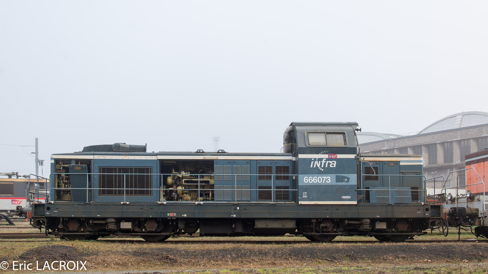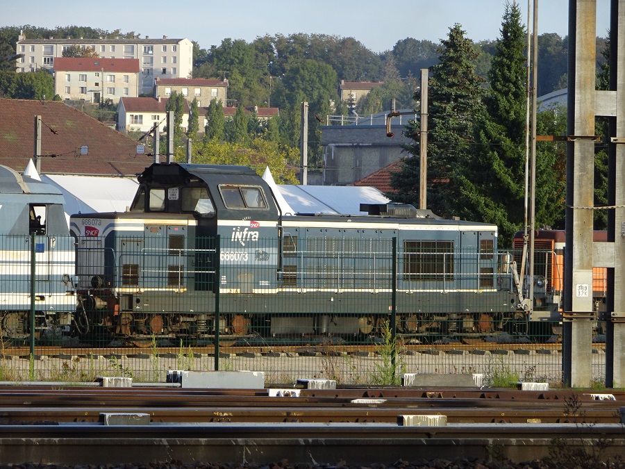 Voici la 666073 Infra en livrée bleue de TSP avec le logo dans le dépôt de Saint Pierre des Corps le samedi 05 avril 2014