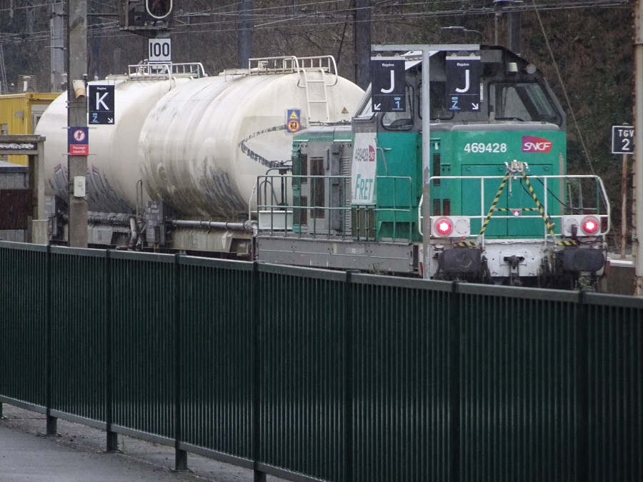 Sur un train Recospray en fevrier 2026 à Poitiers. Composition loco+ 2 citernes+ Rescospay+ couvert G4 + citerne + loco