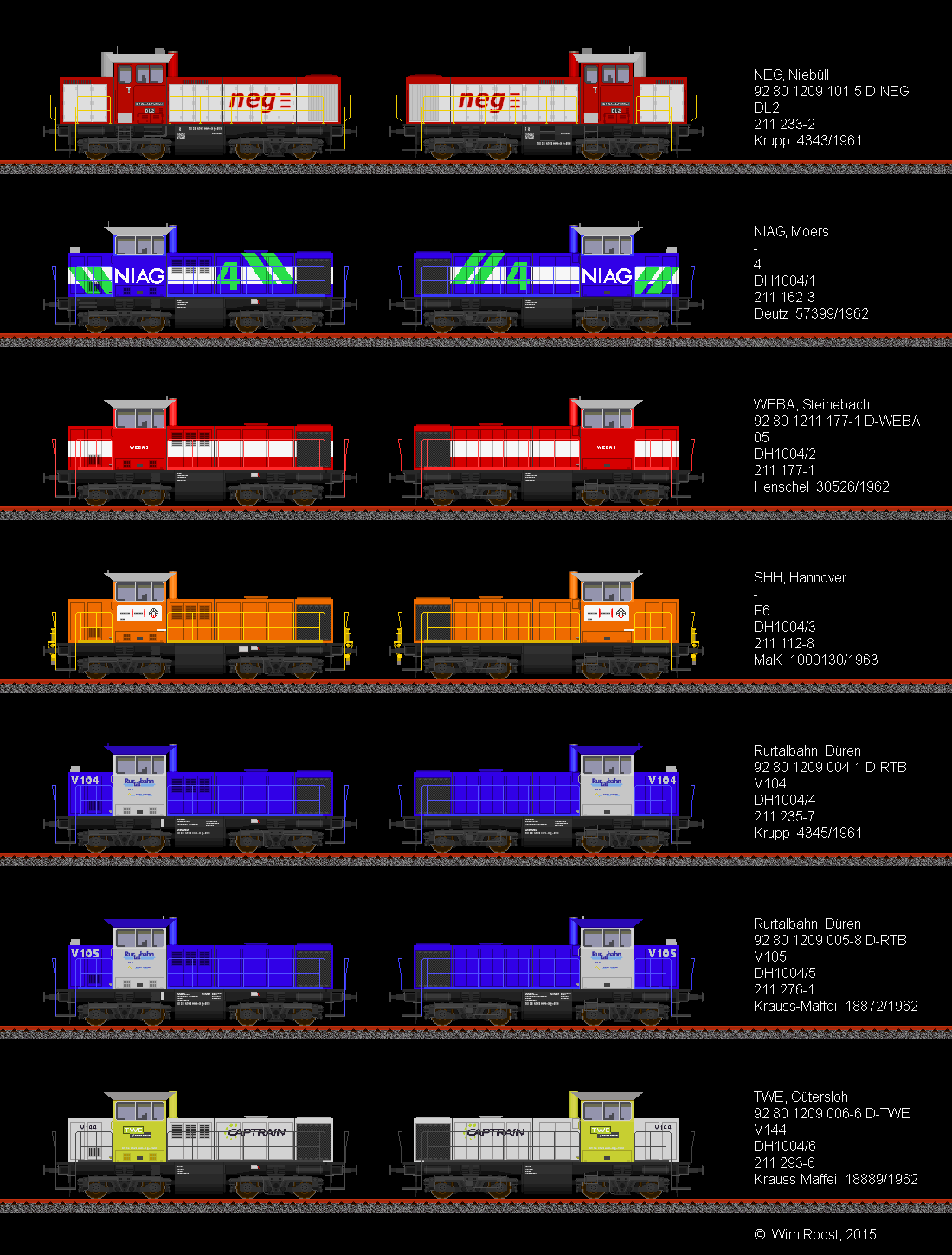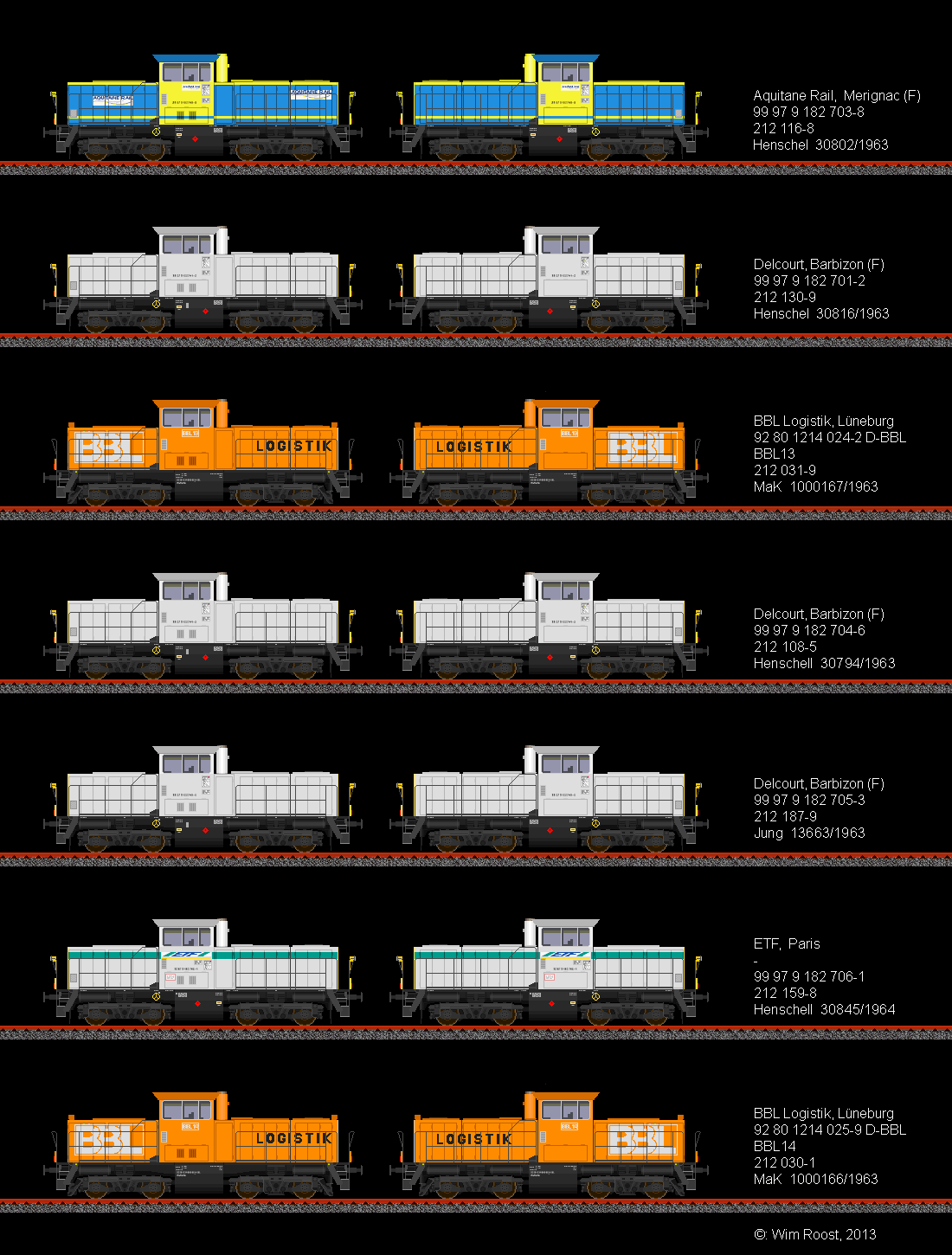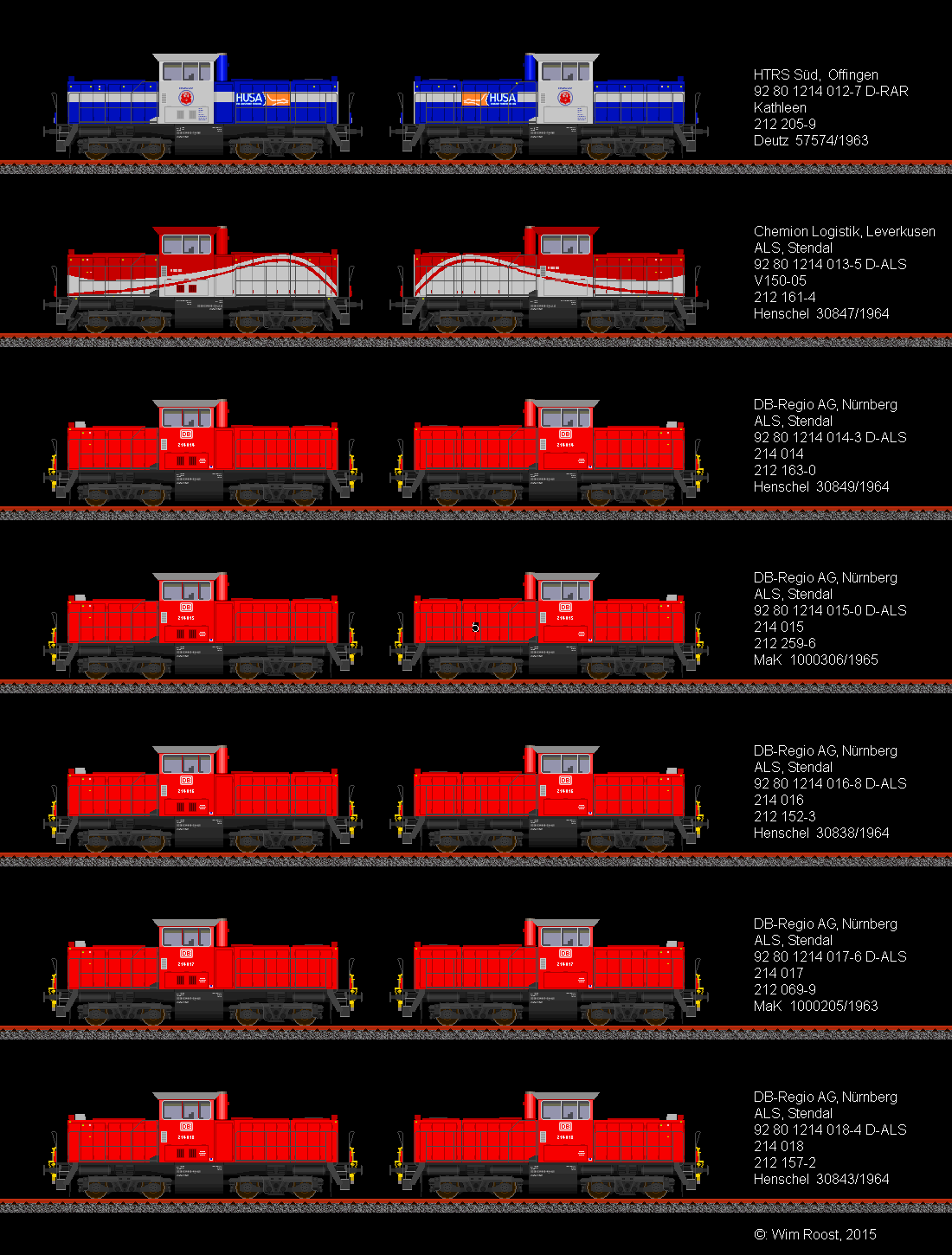 première la seule 211 transformé par Henschel et les 8 211 transformé par OnRail/MaK (Regiolok DH1004). Et après ça les 212 transformé de Alstom Stendal/Gmeinder Mossbach (214)