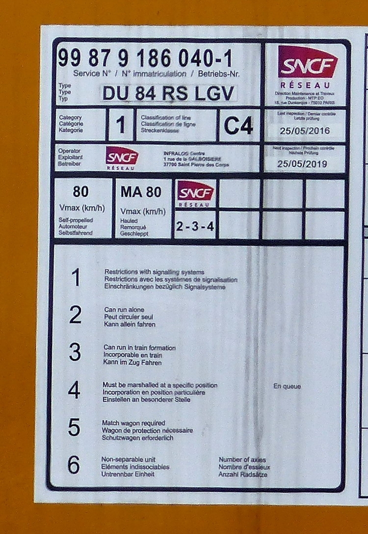 DU 84 RS LGV 9-820 - 99 87 9 186 040-1 SNCF RESEAU (Agrément de travail MTPP 15 122 - 25-05-2016 / 25-05-2016)