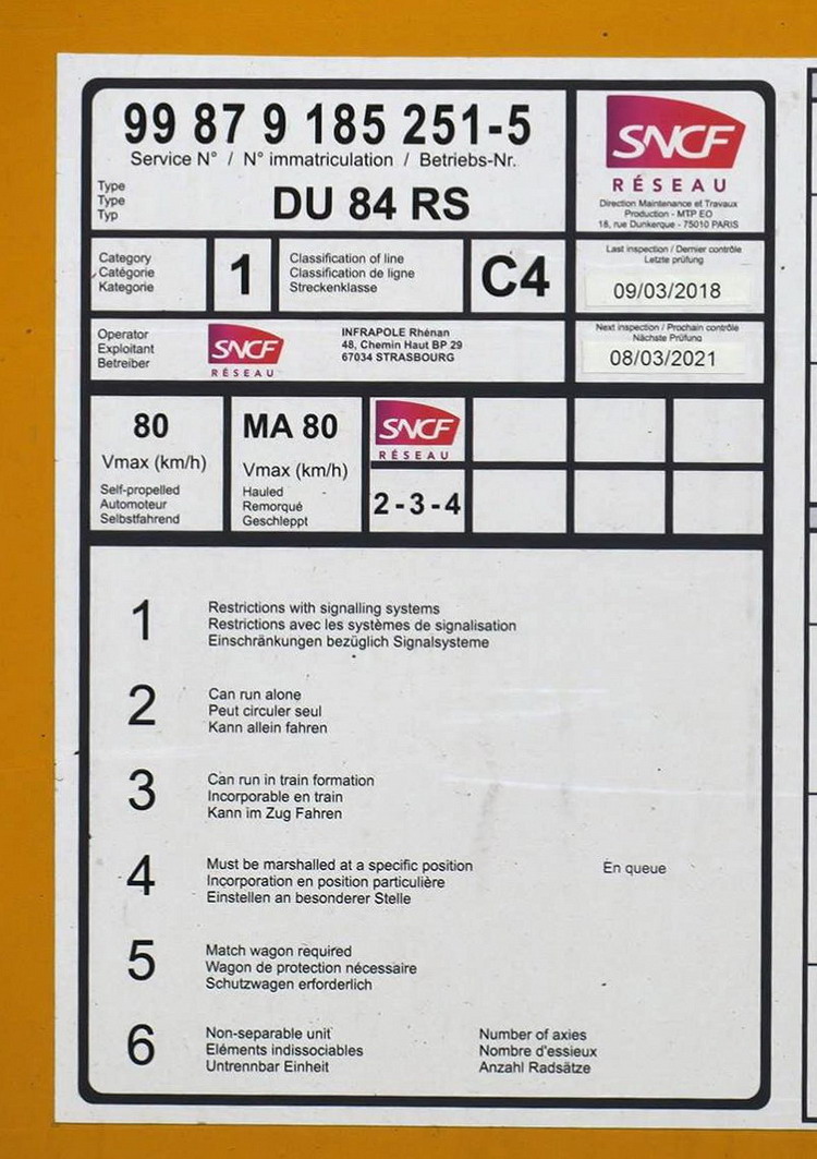 Voici la nouvelle DU84 RS 9-751 - 99 87 9 185 251-5 SNCF RESEAU de l'Infrapole Rhénan point d'attache Strasbourg