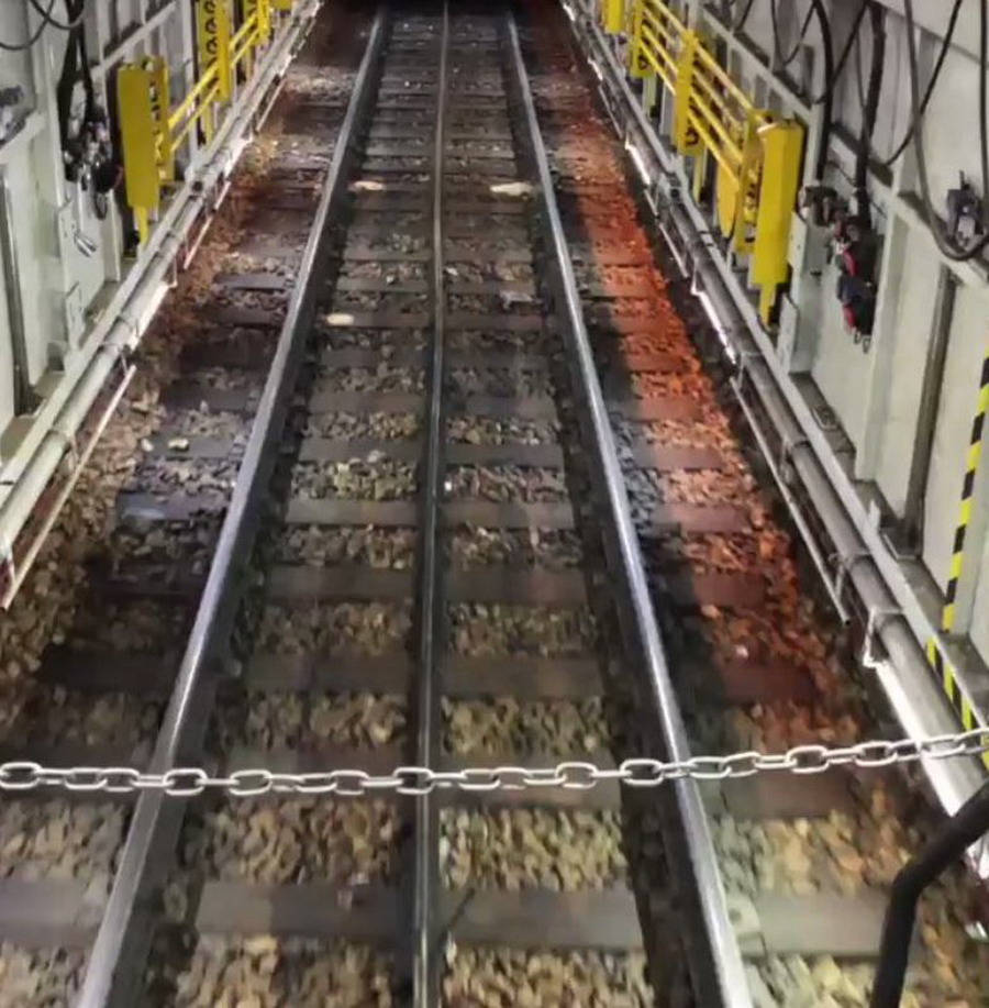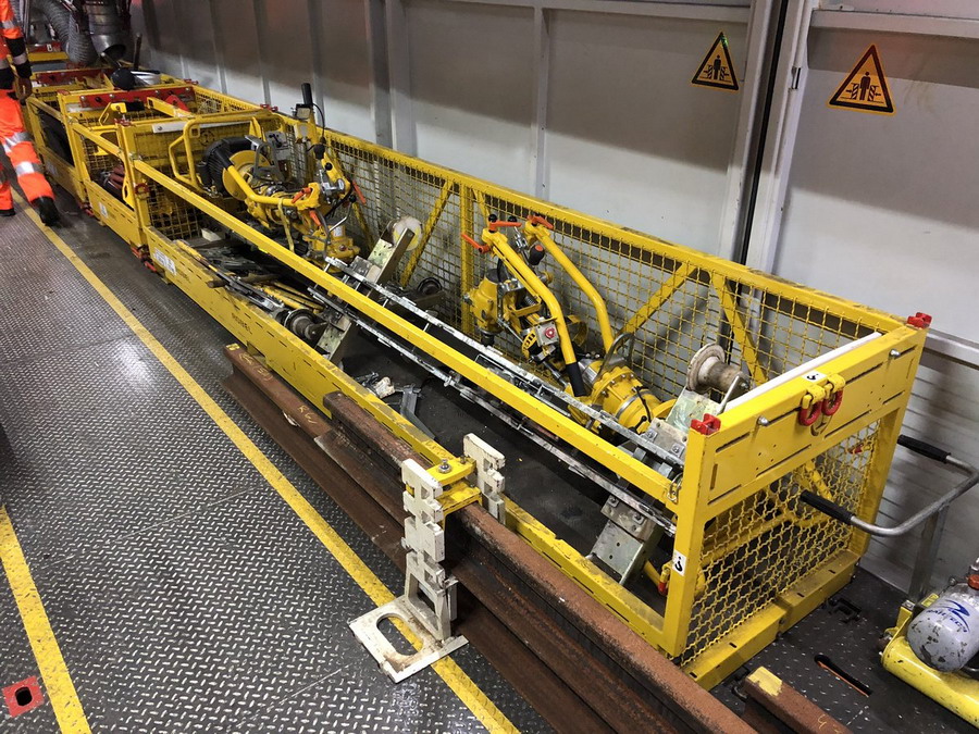 Le vieux rail est maintenant mis hors voie. Il est stocké dans le wagon de stockage, adjacent au wagon de travail.