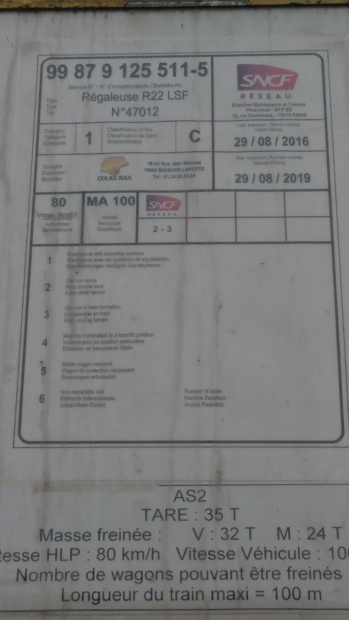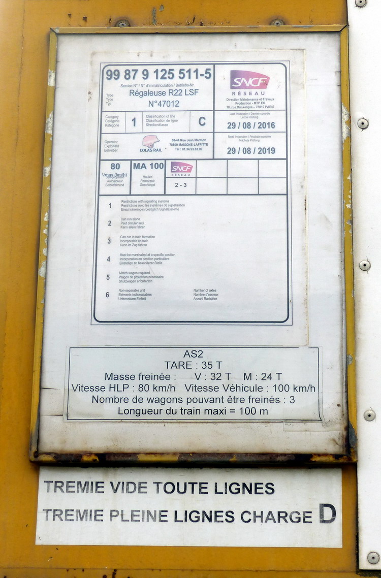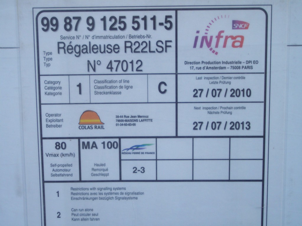 Etant donné que Colas Rail possède au moins 3 R22 LSF répertoriées, que nous avons les n° internes de 2 d'entre elles (F 40000 04 & 05), je serais tenté de dire qu'il s'agit de la 3ème (ex AS2 PSE 159 puis ex AS2 ATA 0538). Mais supposition n'est valable que si et seulement si Colas Rail ne possède que 3 régaleuses de ce type !