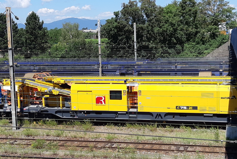 Voici l'élément C75 - 2C de la Dègarnisseuse de Transalp Renouvellement dans le triage de Mulhouse Nord le 20 juin 2018 arrivant de Suisse
