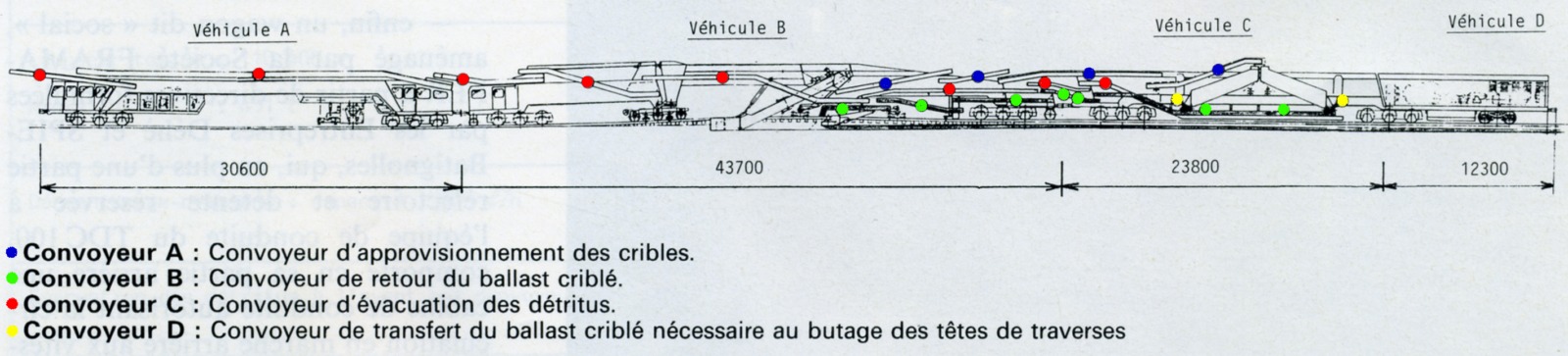 Le convoyeur bas (si c'en est un !) doit pouvoir pivoter pour se positionner perpendiculairement à la voie et pouvoir rejeter le ballast non récupérable sur les côtés de la voie (et non sur la voie), sur le talus comme peut le faire un wagon tapis-canon. Dans ce cas, les tombereaux ne sont pas nécessaires.