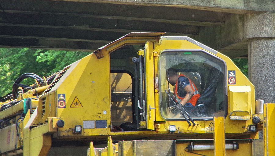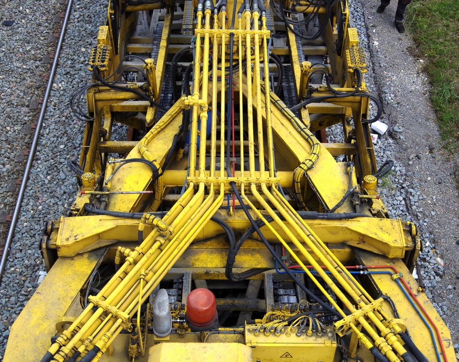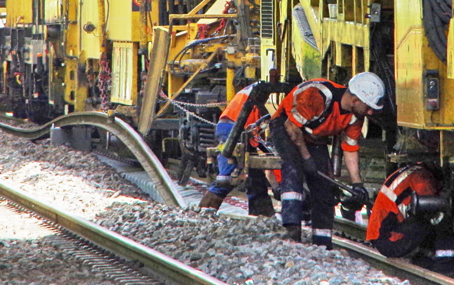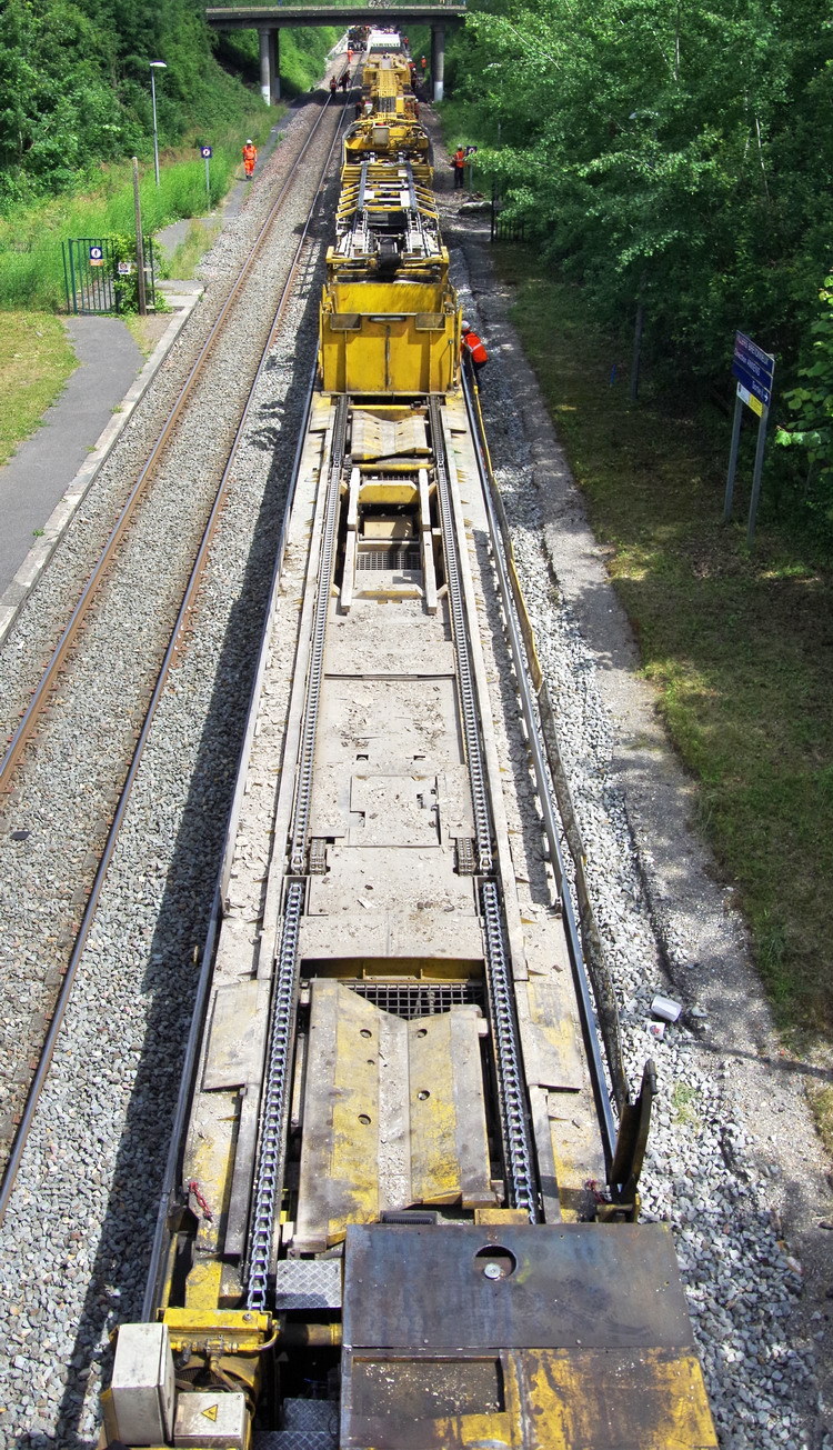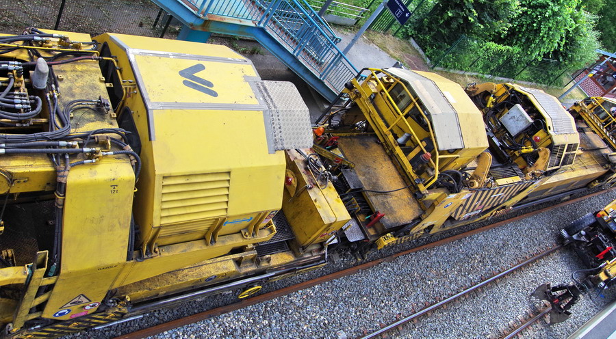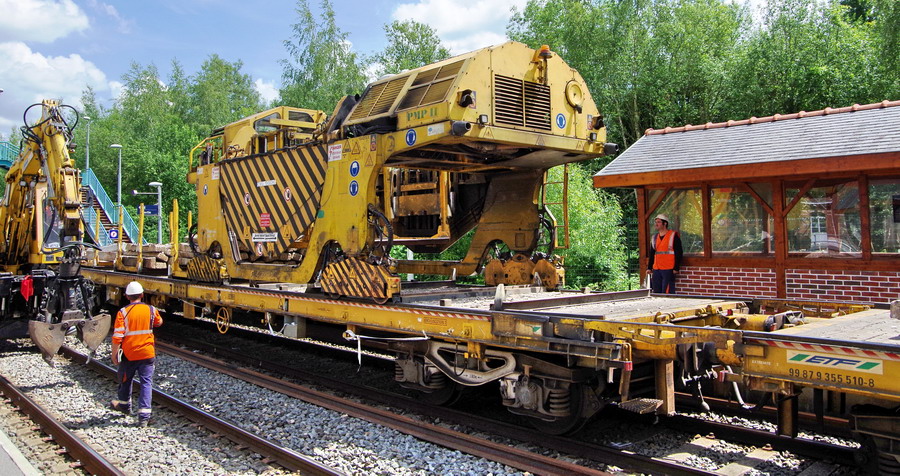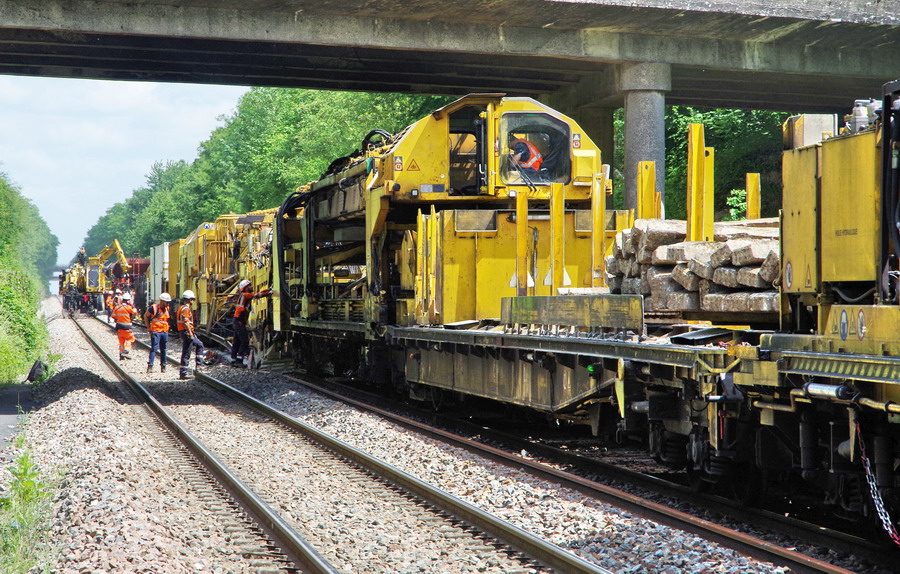 . wagon 5 WF - force avec poutre : évacuation du ballast, enlèvement des anciens rails et pose de nouveaux longs rails soudés