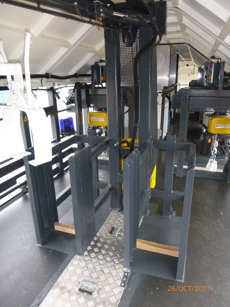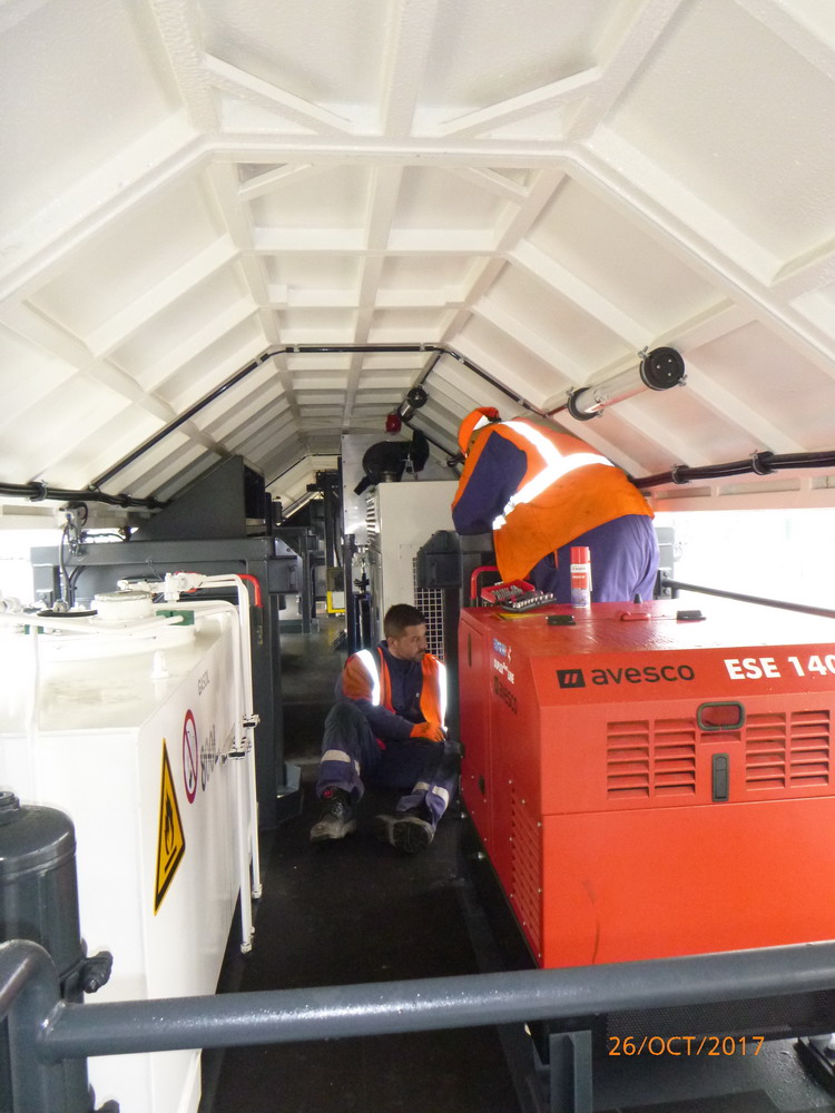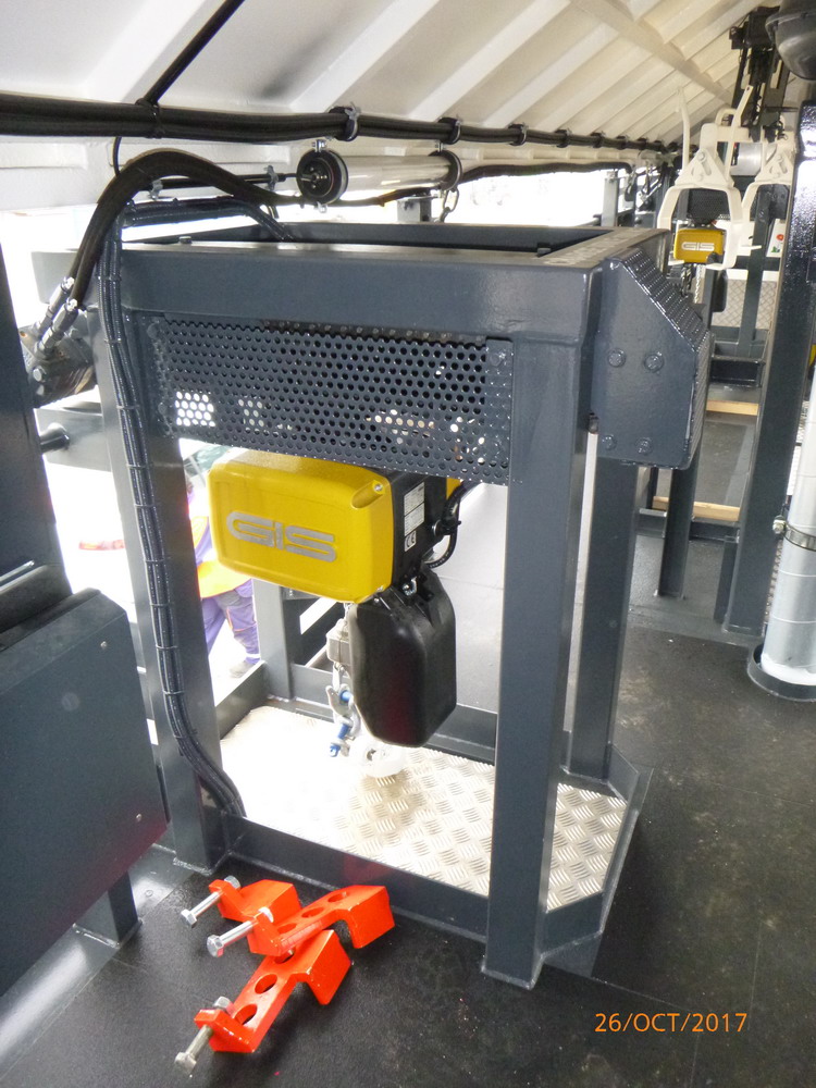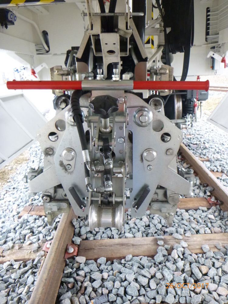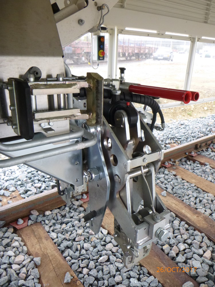 Nous pouvons voir les outils, l'énergie, les cabines, les sièges pour les ouvriers, l'extraction des gaz de soudure, le treuil pour manipuler les traverses et leurs points de stockage de part et autres du treuil. les trois treuils pour les coupons de rail (par fil de rail) six en tout.