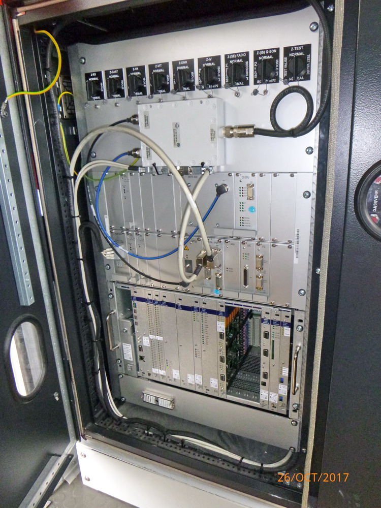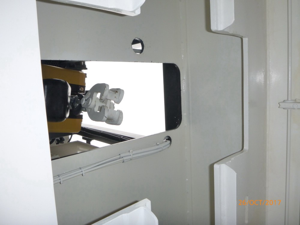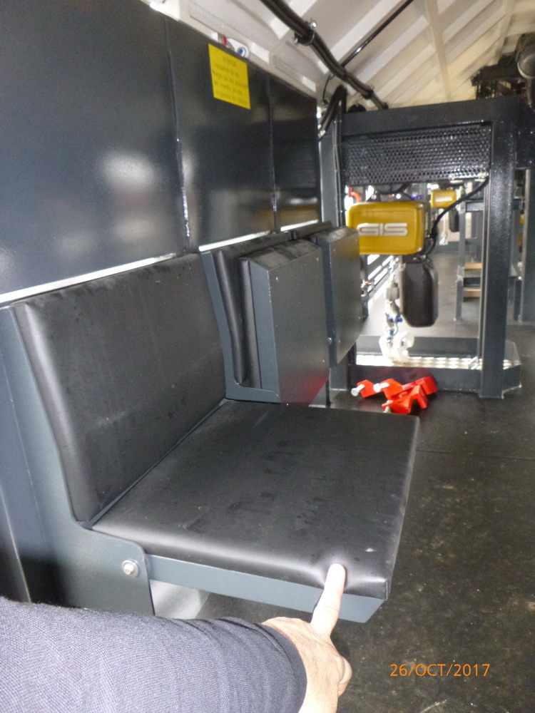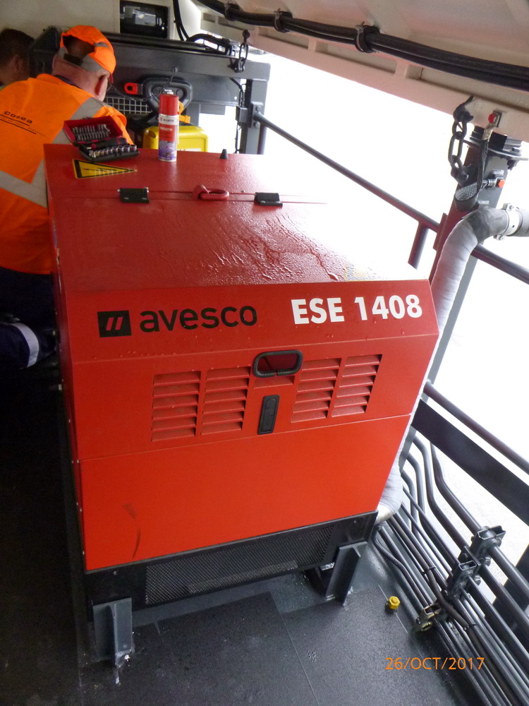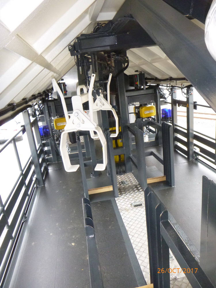 Nous pouvons voir les outils, l'énergie, les cabines, les sièges pour les ouvriers, l'extraction des gaz de soudure, le treuil pour manipuler les traverses et leurs points de stockage de part et autres du treuil. les trois treuils pour les coupons de rail (par fil de rail) six en tout.