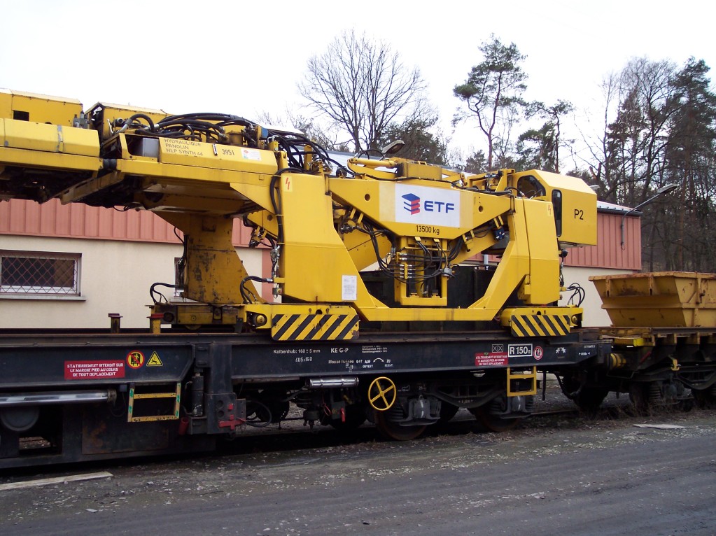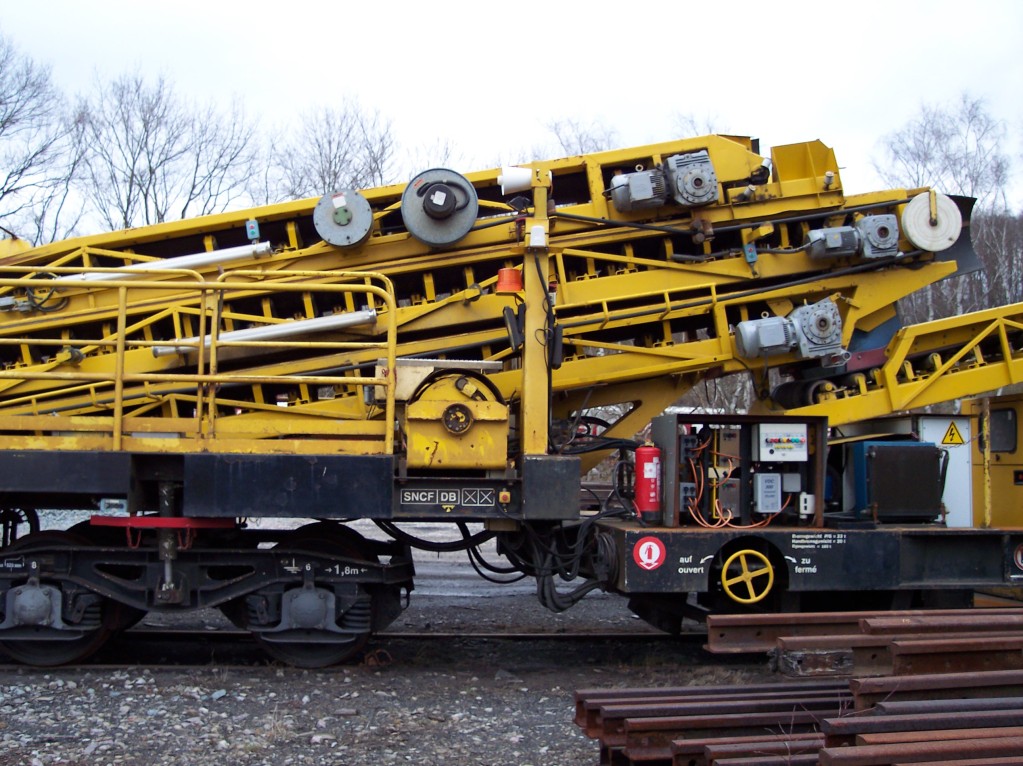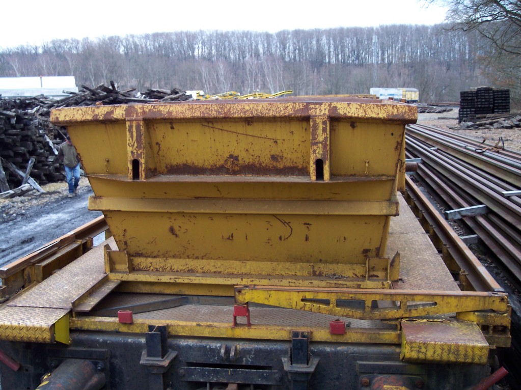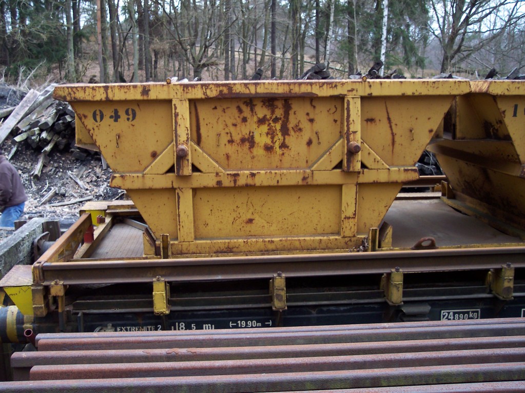 Que sont ces sortes de bennes jaunes (sans doute amovibles) sur les wagons plats?Pour le ballast usagé je m'en doute mais leur forme?Ce pourrait être intéressant à reproduire sur un wagon.
