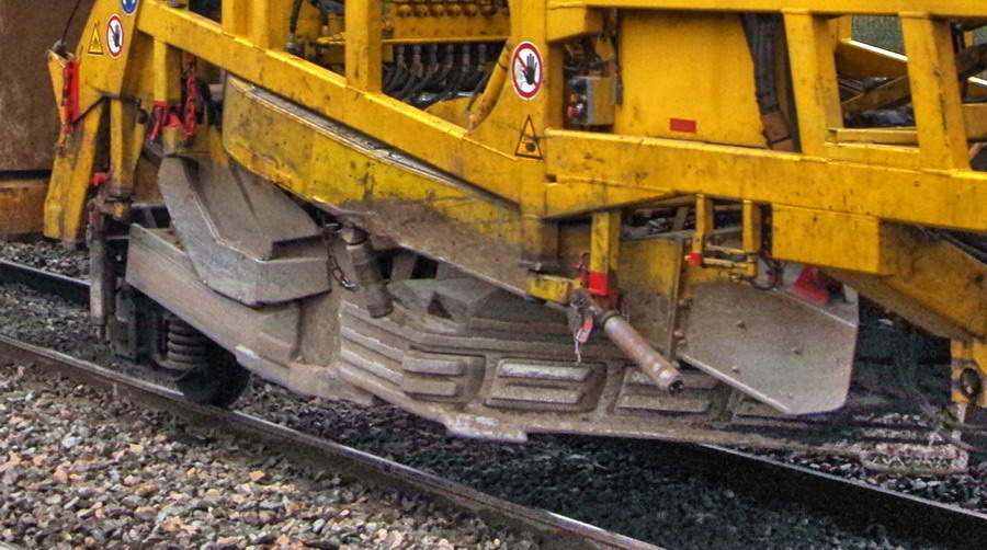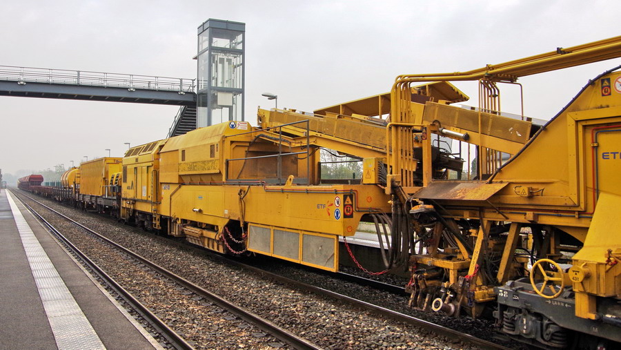 . wagon 5 WF - force avec poutre : évacuation du ballast, enlèvement des anciens rails et pose de nouveaux longs rails soudés