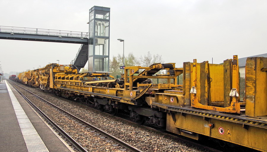 Wagon 5 - Wagon WF (Wagon force avec poutre : évacuation du ballast, enlèvement des anciens rails et pose de nouveaux longs rails soudés)pour le 99 87 9 311 503-6 P95 passage en gare de Ham voie 2 le 09-04-2018