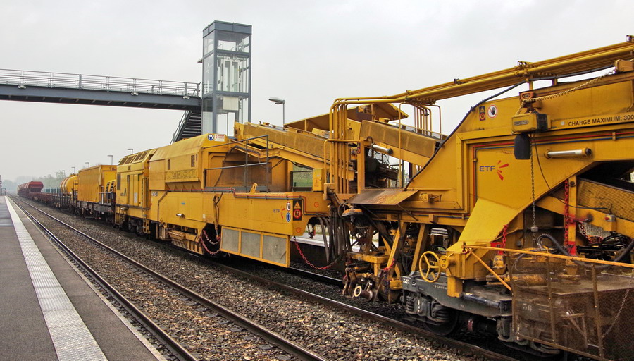 Voici le passage en gare Ham (80) sur voie 2 le lundi 09 avril 2018 de la rame du trains de coupe et de pose le P95 - 99 87 9 311 503-6 - ETF - "Addax"