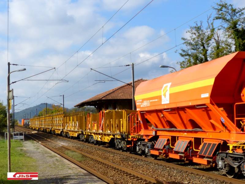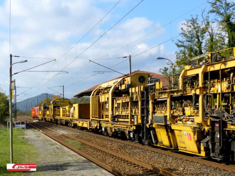 Le convoi de renouvellement de l'infra GIPERAIL TSV 21 GP composé d'un wagon trémie doseuse, du TSV 21 GP dit "train de renouvellement", d'un wagon énergie, d'un wagon citerne, de 3 wagons "Framafer" pour l'entreposage et la substitution des traverses,