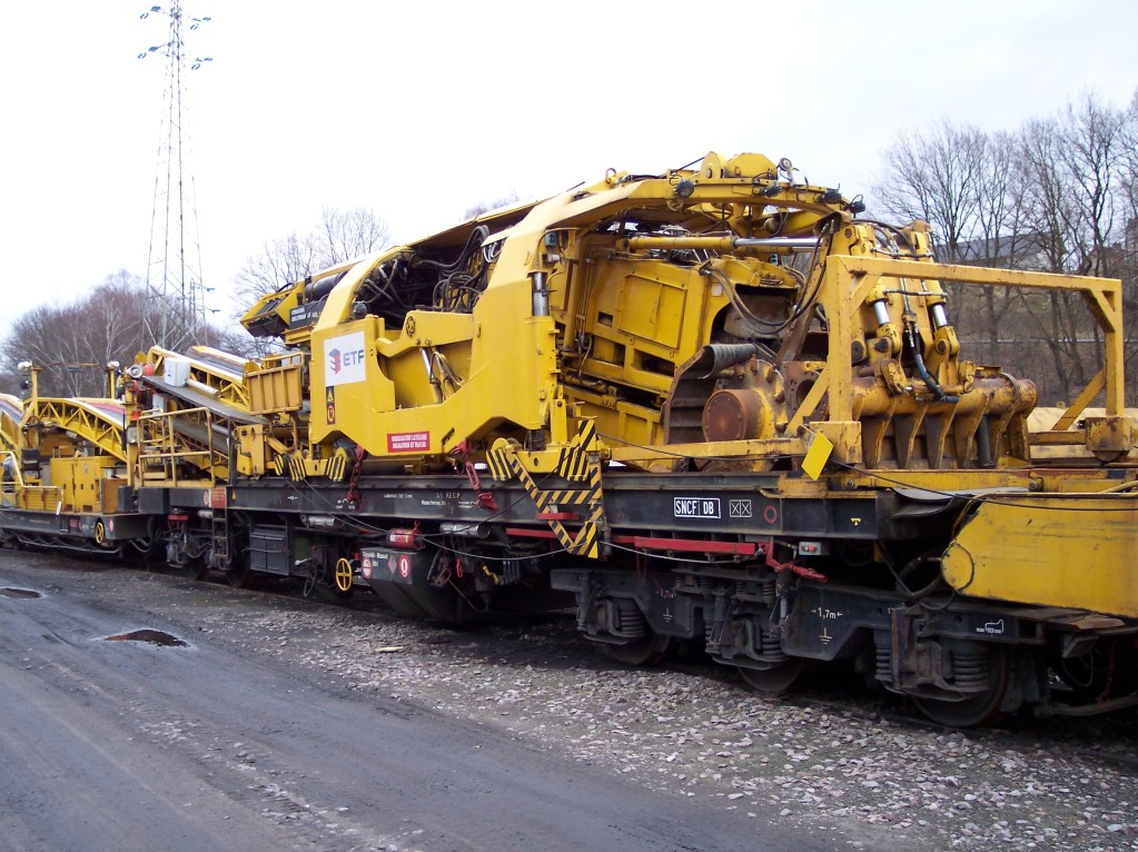Que sont ces sortes de bennes jaunes (sans doute amovibles) sur les wagons plats?Pour le ballast usagé je m'en doute mais leur forme?Ce pourrait être intéressant à reproduire sur un wagon.