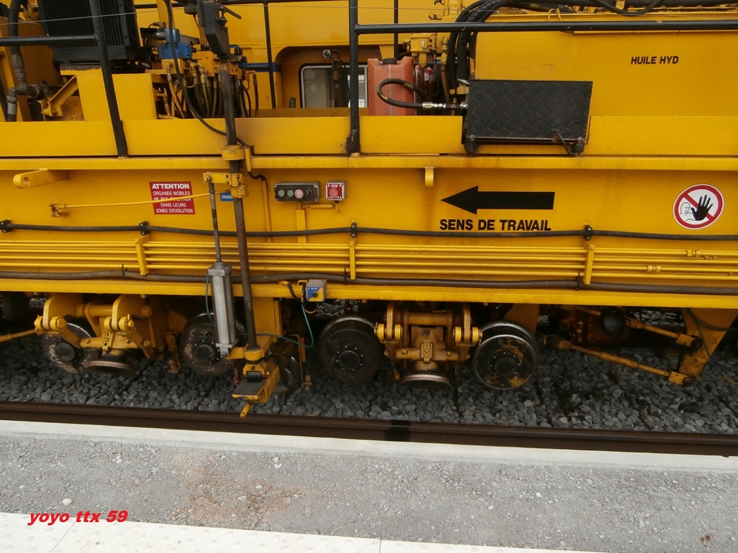 Voici maintenant après le dessus du wagon , quelques photos de détails du dessous de celui ci .Toujours a Gravelines le 17/08/2014 sur le chantier de la ligne Dunkerque / Calais :Et voila .