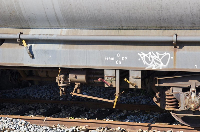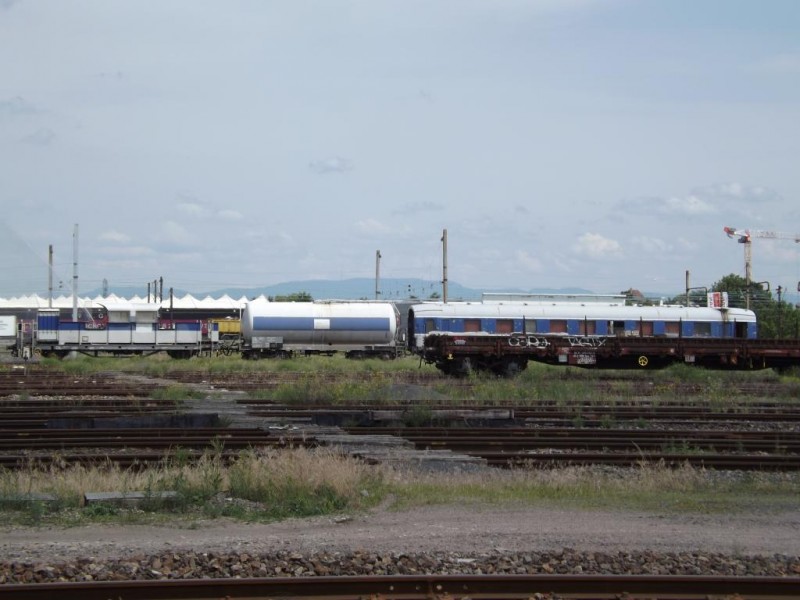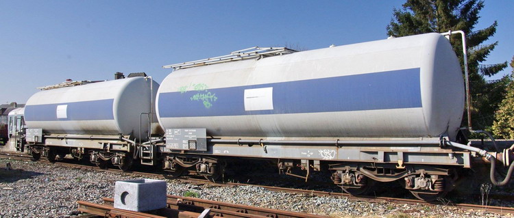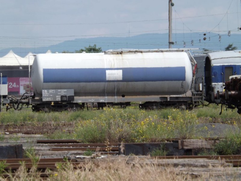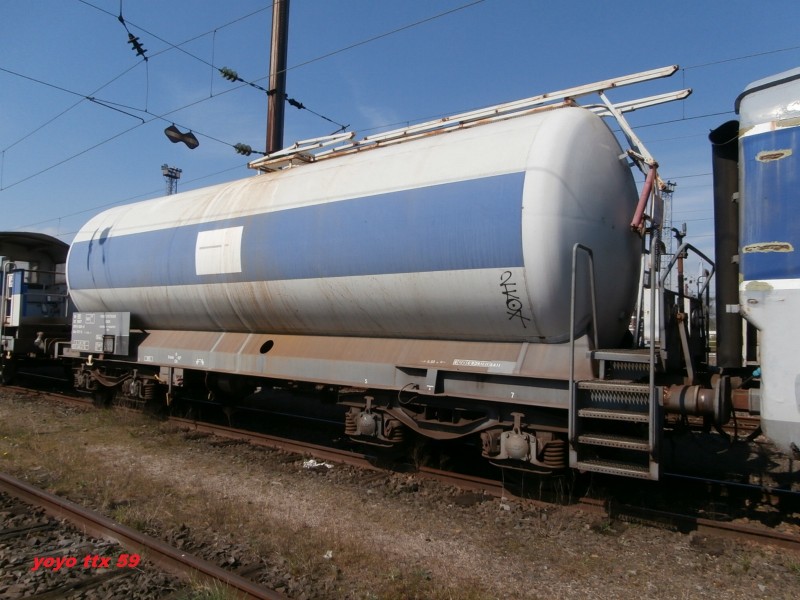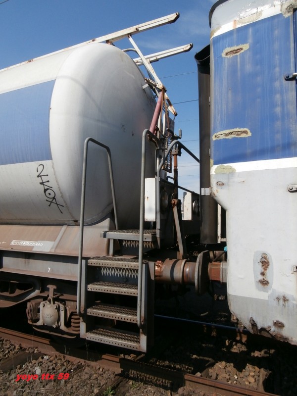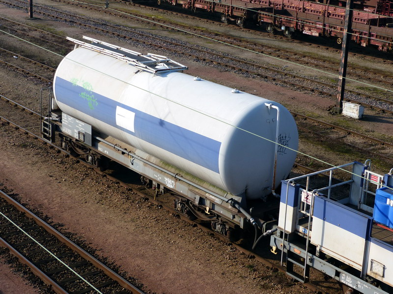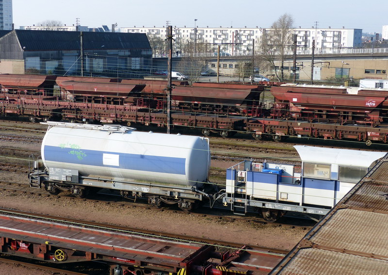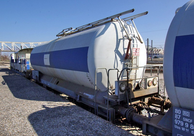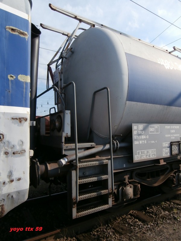Voici le wagon citerne 80 87 979 9 804-0 Uas W64 6 SNCF-RO - Point d'attache Caen dans une rame laveur d'isolateur Ã