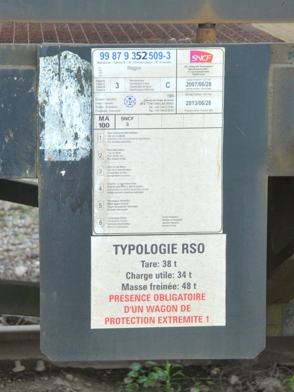 Voici une nouveauté ici (je pense), le 99 87 9 352 509-3, un "tapis-roulant" sur un châssis plat a bogies UIC (ou Y19 dans la vocabulaire SNCF), Rs ou auparavant Rory dans la vocabulaire SNCF.