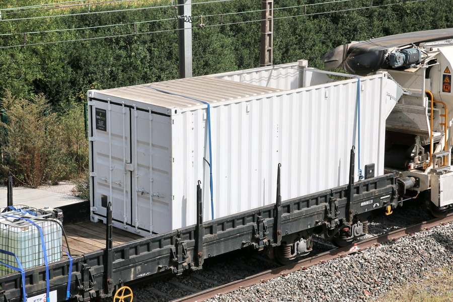 wagon plat de protection R90 - 99 87 9 383 779-5 avec petit container blanc ouvert pour le tapis des Double flux ETF