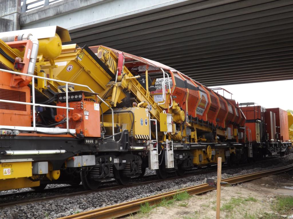 Wagon qui travaille avec la dégarnisseuse RM 90 NR - 99 87 9 314 510-8 - Colas Rail.