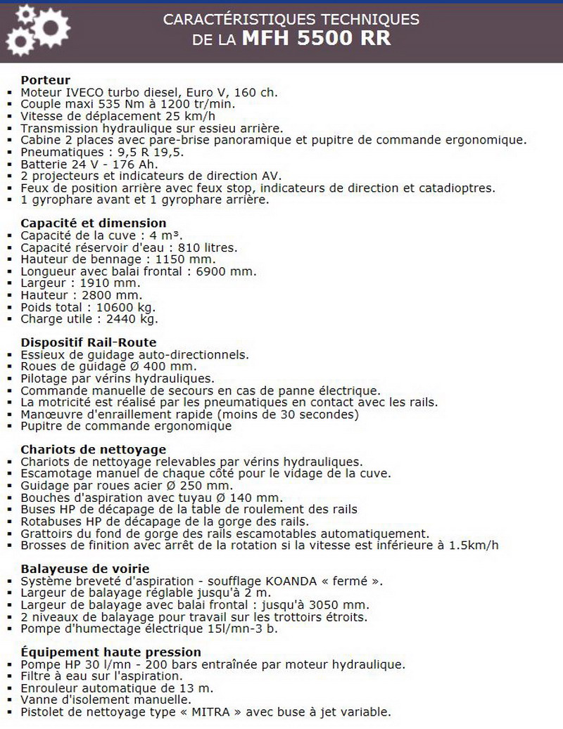 Véhicule complet assurant le balayage des voies, le nettoyage haute pression des rails, le grattage du fond de gorge