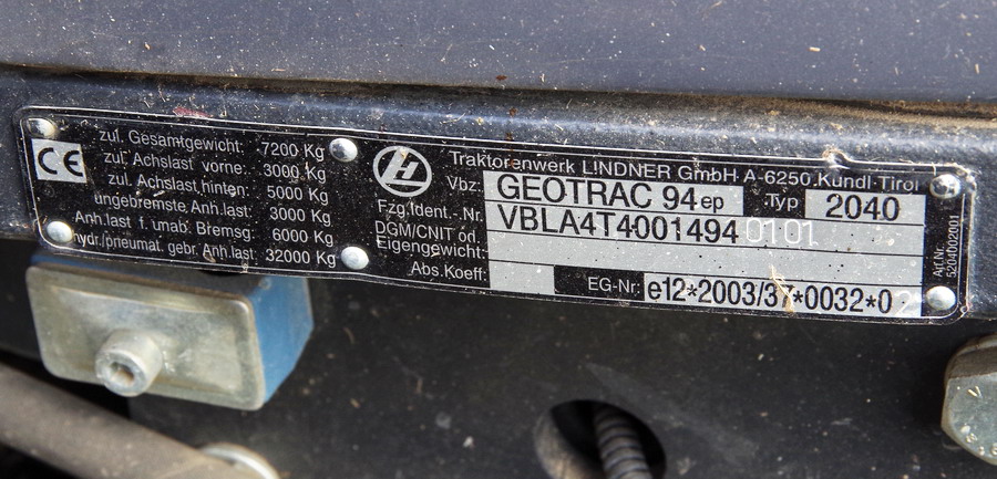 Tracteur LINDNER Geotrac 94ep n°VBLA4T40014940101 de type 2040 avec immatriculation DV-379-SN (54)