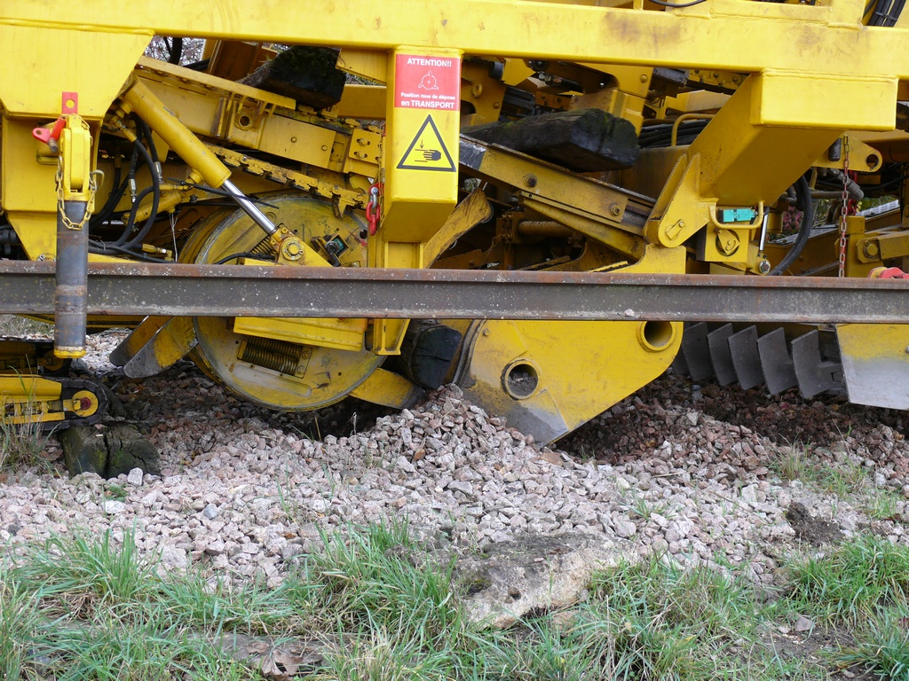 Ensuite une lame vibrante en forme de V écarte l'ancien ballast sur les cotés de la voie. Cette machine est équipée également d'une dégarnisseuse et peut rejeter le ballast sur les traverses neuves ou sur le coté de la voie. Elle n'est pas utilisé au moment de la photo.