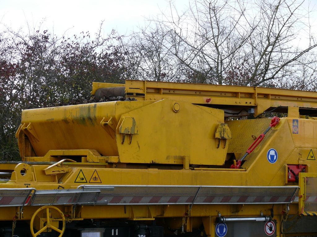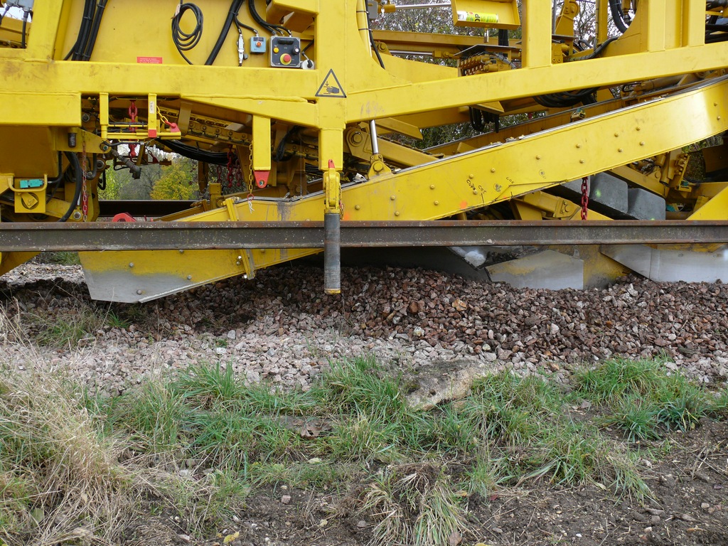 Ensuite une lame vibrante en forme de V écarte l'ancien ballast sur les cotés de la voie. Cette machine est équipée également d'une dégarnisseuse et peut rejeter le ballast sur les traverses neuves ou sur le coté de la voie. Elle n'est pas utilisé au moment de la photo.