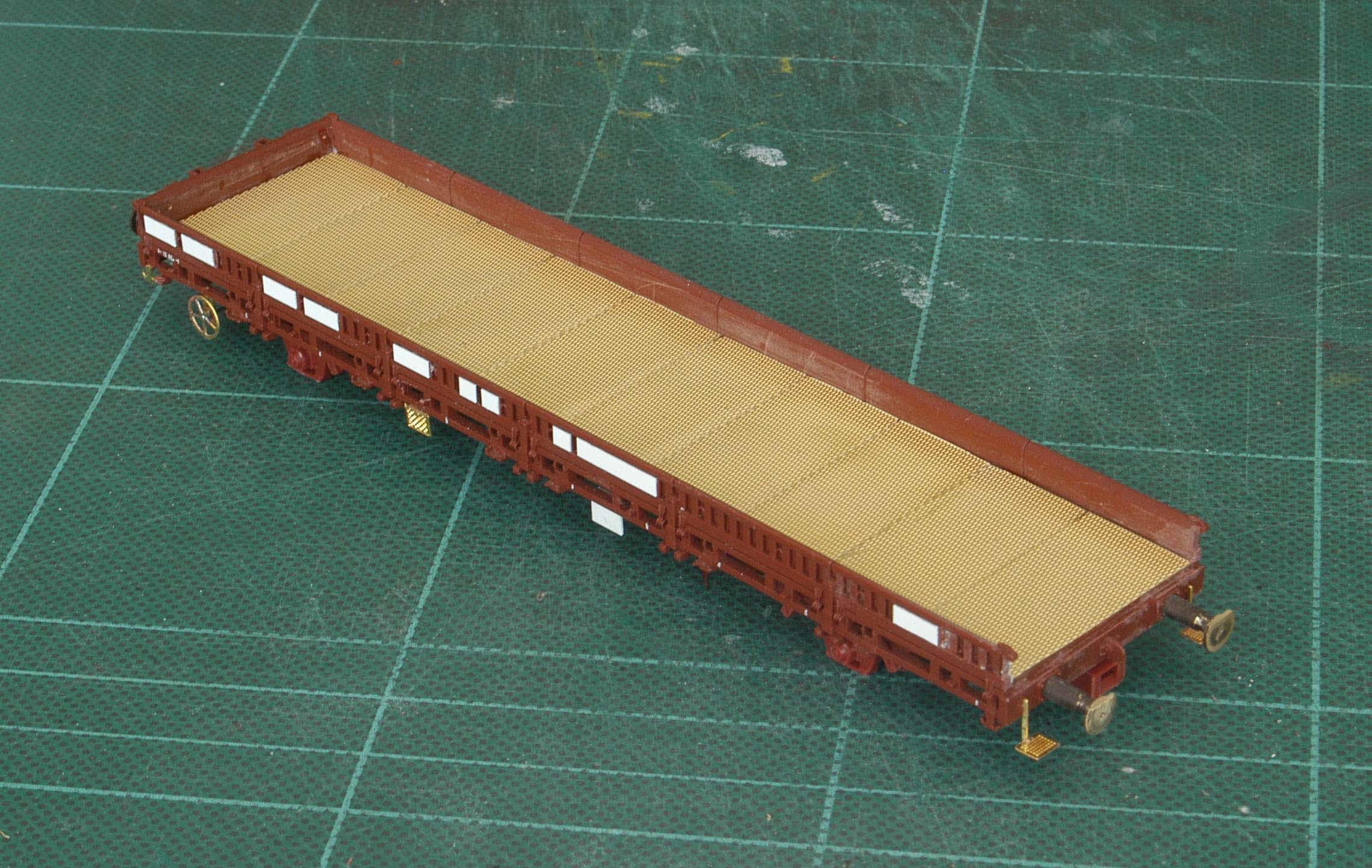 Poncer le dessus des tampons côté ridelle supprimée, puis réaliser les nouvelles ridelles en carte plastique. Ces ridelles se rabattent (en réalité seulement :roll: ) sur les tampons et sont raccordées à une rampe démontable qui permet de monter ou descendre la caleuse sans pour autant avoir besoin d'une quelconque grue.