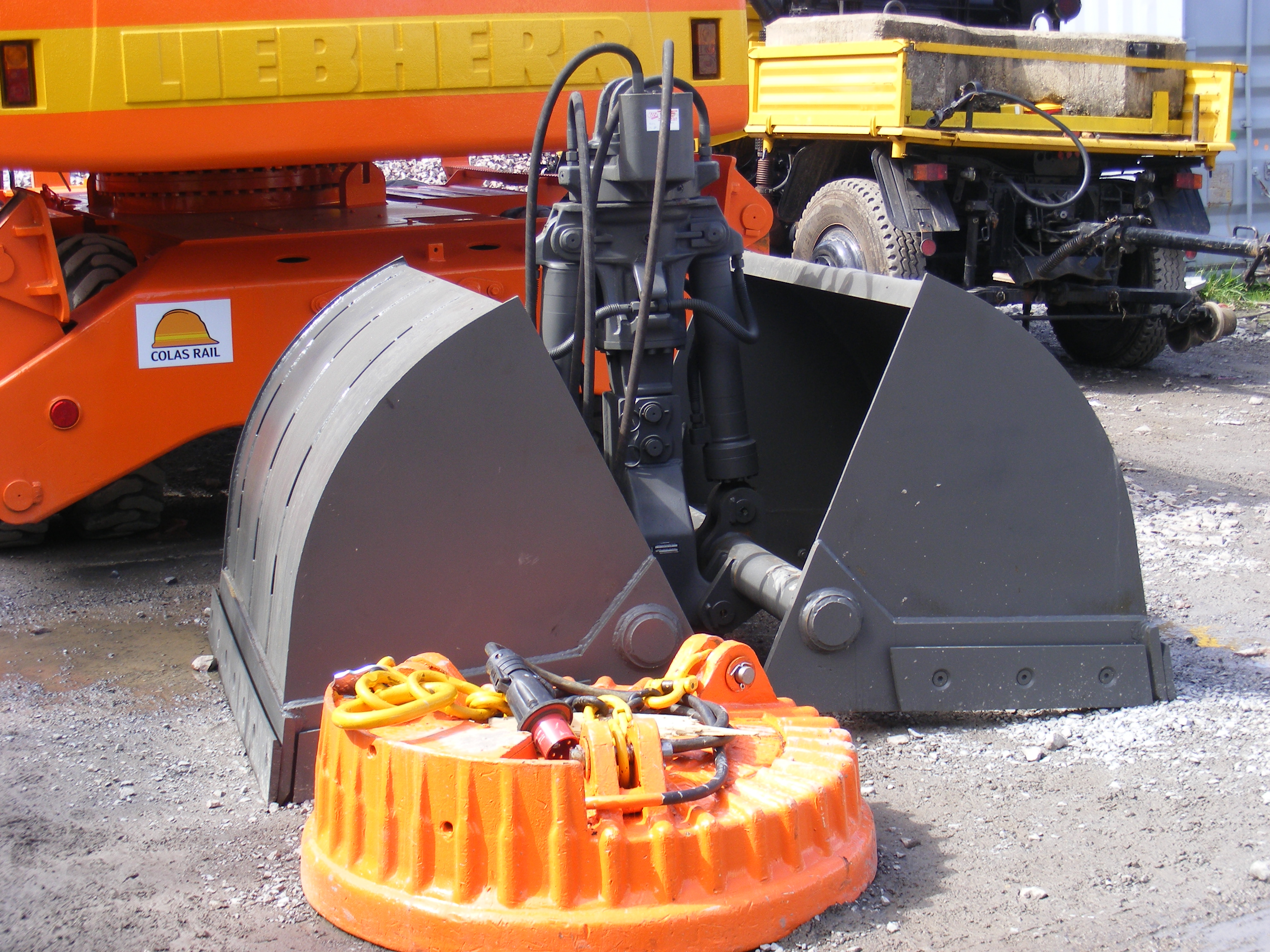 Je ne sais pas si cette pelle a déjà servi sur ce chantier. Elle est comme neuve, et les accessoires qui l'entourent le sont aussi. A mon avis, elle utilise(ra ?) le godet que l'on aperçoit derrière elle et que l'on voit un peu mieux sur cette photo.